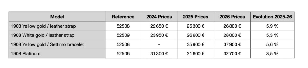 Nazadnje še kolekcija Rolex 1908, ki je znana po svojih elegantnih urah in prav tako ni izjema pri precejšnjem zvišanju cen, saj so vsi modeli izdelani iz plemenitih kovin. Cene so se zvišale za 2.000 evrov celo za nedavno predstavljene modele z zapestnicami Settimo, medtem ko se je cena za čudovito platinasto različico z giljoširanim ledeno modrim številčnicam zvišala »le« za 1.100 evrov.