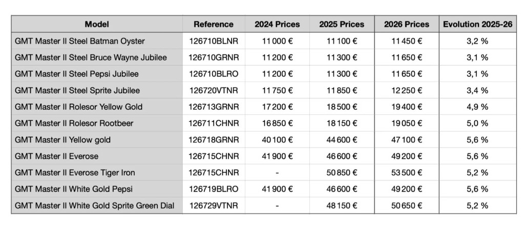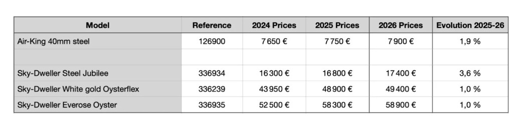 To je le nekaj razlogov, ki bi lahko pojasnili znatno povišanje cen Rolexa za leto 2026. Druga, bolj preprosta razlaga je, da Rolex želi izkoristiti val na katerem pluje, ter ustvariti čim večji dobiček. Sprememba cene je odvisna od kolekcije ter materiala le-te, se pa giblje od nekaj 100 pa do več 1.000 evrov.