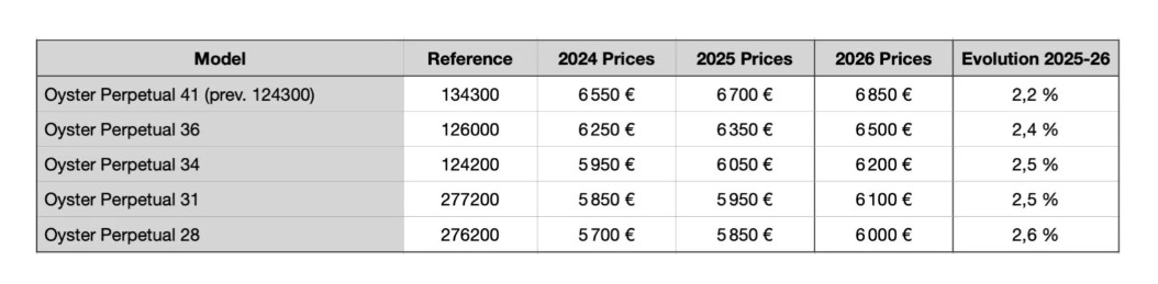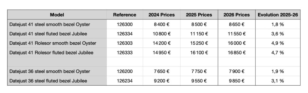Modela Datejust in Oyster Perpetual se letos ne soočata s tako opaznim porastom cen, saj bo za kovinski Oyster Perpetual 41 odslej potrebno odšteti 6.850 evrov, kar je 150 evrov več kakor v lanskem letu. Za primerjavo, kovinski Oyster Perpetual 41 je še pred petimi leti nosil etiketo 5.750 evrov. Kovinski Datejust 41 se v obdobju leta podražil za 150 evrov in bo tako nosil izhodiščno ceno 8.650 evrov.