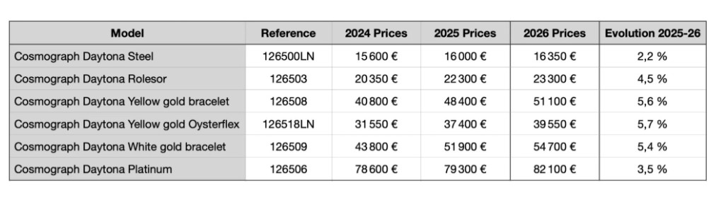 Rolex Daytona se z letnico 2026 na ceniku kotira na 16.350 evrov, kar je 350 evrov več kot v lanskem letu. A vseeno je najbolj zaželenemu modelu v času Covida cena precej poskočila, saj je v 2023 znašala 14.650 evrov, leto prej 13.700 evrov, medtem ko v 2021 ”zgolj” 12.400 evrov. Pomembno dejstvo je, da tukaj pišemo o cenah novih modelov kupljenih pri pooblaščenih prodajalcih!