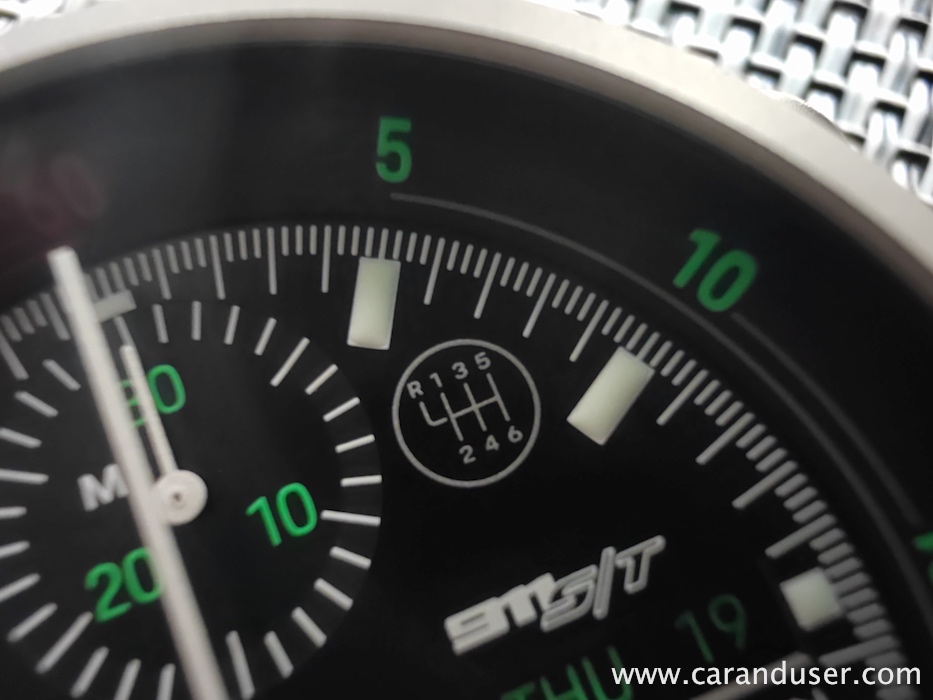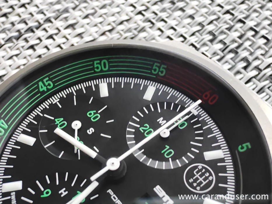 | Številčnica | Črna mat številčnica z belimi kazalci in indikatorji. Obroba številčnice v stilu števca vozila 911 S/T. Emblem menjalnika ob 14. uri. |