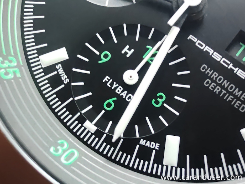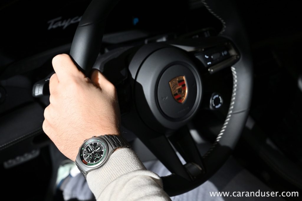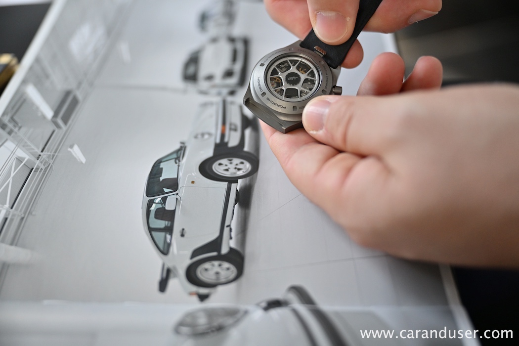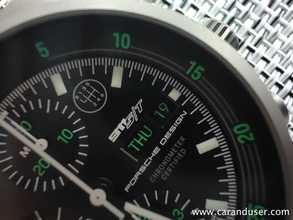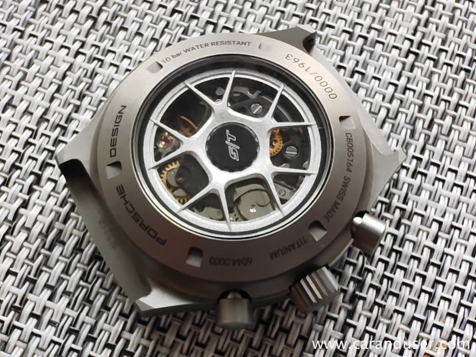 Puristi bodo cenili dodatek emblema ročnega menjalnika na številčnici ter barvne uskladitve roba številčnice z instrumentno ploščo modela 911 S/T. Naslednja ”velikonočna jajčka” pa je rotor mehanizma v obliki dotičnega litega platišča. Viden je skozi hrbtno stran, kjer domuje hišni avtomatski mehanizem, kaliber WERK 01.240, s certifikatom COSC in kronografsko funkcijo flyback. Z 48-urno rezervo energijo navitja in frekvenco delovanja 4 Hz se zdi, da je ta mehanizem popolnoma primeren za kronograf z avtomobilsko tematiko.