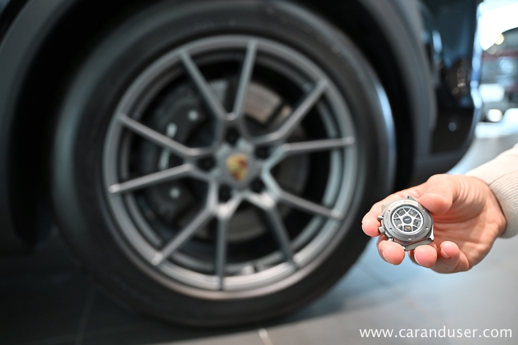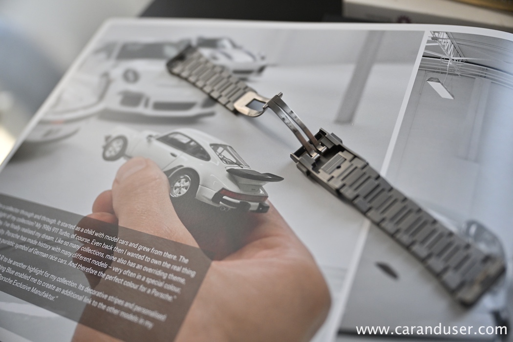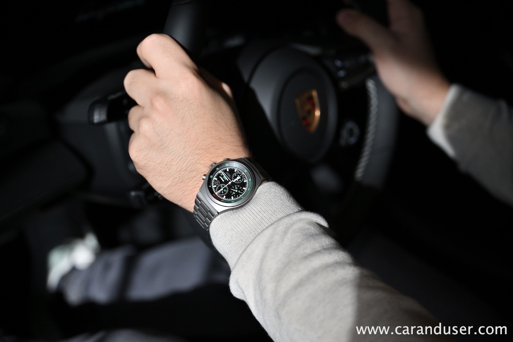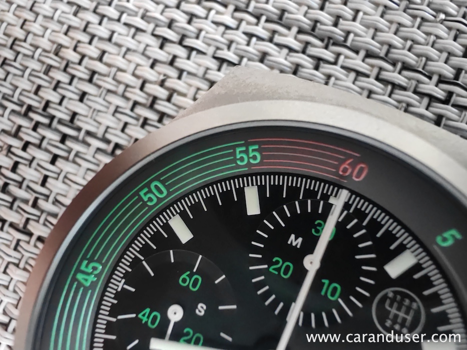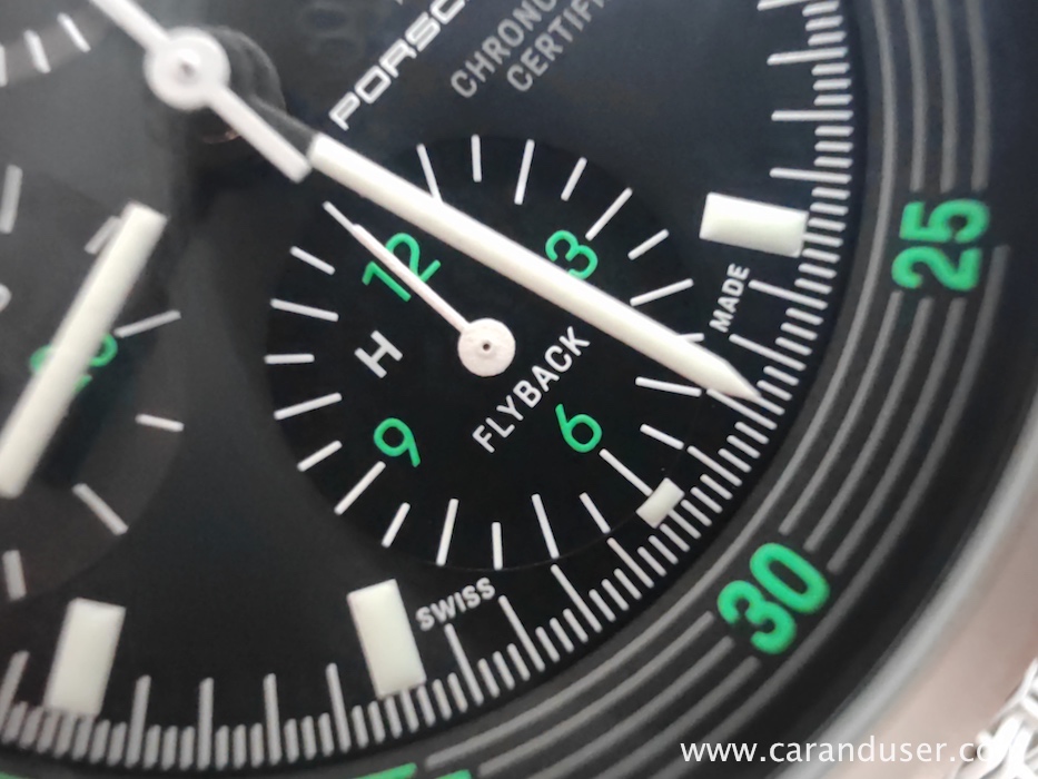 Puristi bodo cenili dodatek emblema ročnega menjalnika na številčnici ter barvne uskladitve roba številčnice z instrumentno ploščo modela 911 S/T. Naslednja ”velikonočna jajčka” pa je rotor mehanizma v obliki dotičnega litega platišča. Viden je skozi hrbtno stran, kjer domuje hišni avtomatski mehanizem, kaliber WERK 01.240, s certifikatom COSC in kronografsko funkcijo flyback. Z 48-urno rezervo energijo navitja in frekvenco delovanja 4 Hz se zdi, da je ta mehanizem popolnoma primeren za kronograf z avtomobilsko tematiko.