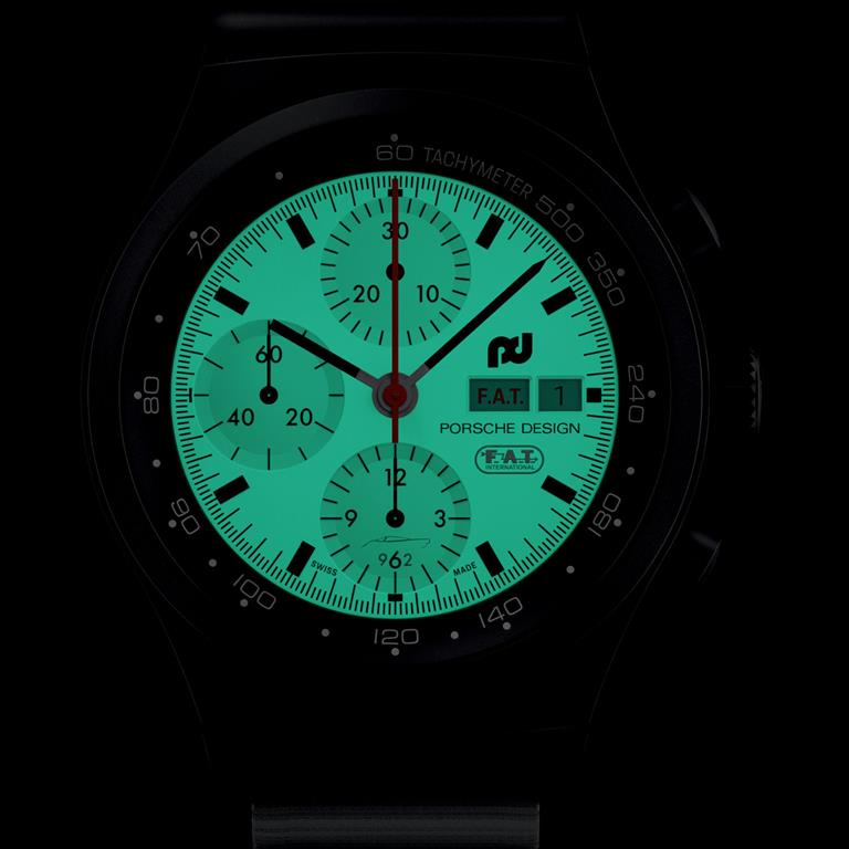 Bela številčnica, zaščitena s sedemslojnim antirefleksnim premazom in na praske odpornim safirnim steklom, se ponaša s tremi ”bonbončki. Najprej je na urnem števcu kronografa silhueta Porscheja 962, ki je vidna le v temi oziroma ob aktivni luminiscenci. Sledi logotip F.A.T. International, ki je našel mesto pod okencem dneva in datuma. Posebnost pa je še preimenovanej dnevov v tednu in sicer sta „SAT“ in „SUN“ zamenjana s kratico „F.A.T.“ v značilni rdeči barvi.
