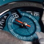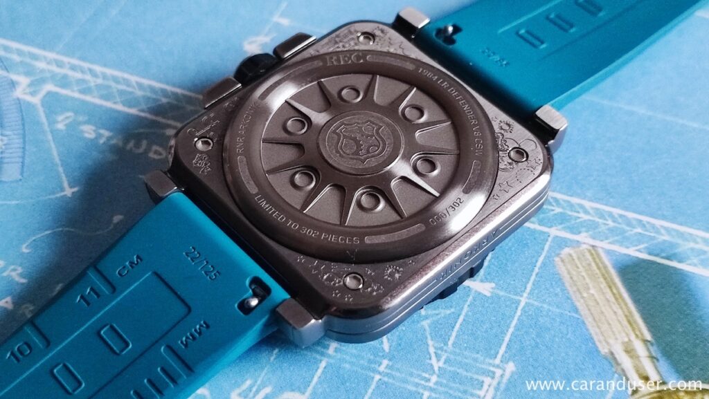 | Številčnica | Ročno izdelana aluminijasta številčnica, izrezana neposredno iz Land Roverja UJO iz leta 1984; prikaz datuma ob 9. uri; modra skala ur in minut; kazalci napolnjeni z luminiscenčnim materialom |