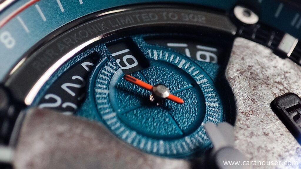 Številčnica ne skriva svojega porekla. V sredici dominira kos voznikovih vrat Akronik Defenderja, pričvrščen s štirimi vijaki. Sklepam, da bo kovina sčasoma malce zarjavela, kar bo ustvarilo svojevrsten čar. Ob 12. uri je mesto logotipa podjetja REC, ob 6. uri pa podjetja Arkonik. Ob 9. uri se nahaja podštevilčnica sekund ter odprt prikaz datuma na modri podlagi. Ravno ta unikaten dizajn je tisto, kar uro naredi posebno, mar ne?