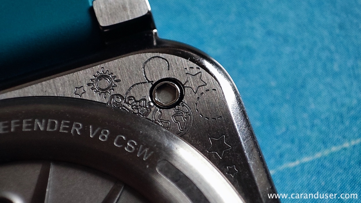 Ohišje je grajeno v sendvič stilu iz treh kovinskih delov ter v premer meri 40 mm, višino 12 mm, razdalja od ušesa do ušesa pa znaša 48,2 mm. Kvadratno ohišje z zaobljenimi robovi spominja na oblikovni element sprednje luči ikoničnega terenskega vozila. Na desni strani ohišja zaščita krone predstavlja masko Defenderja, medtem ko se na levi strani nahajajo vzdolžne črte z boka.