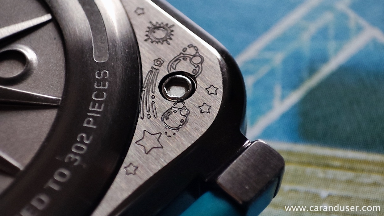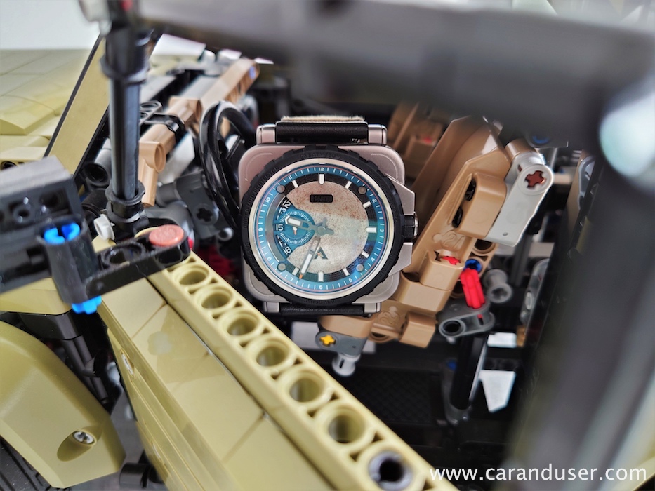 | Številčnica | Ročno izdelana aluminijasta številčnica, izrezana neposredno iz Land Roverja UJO iz leta 1984; prikaz datuma ob 9. uri; modra skala ur in minut; kazalci napolnjeni z luminiscenčnim materialom |