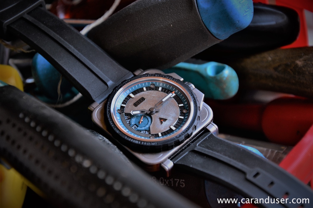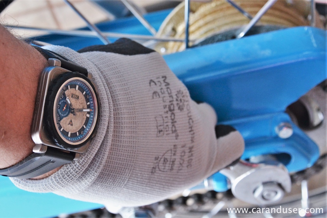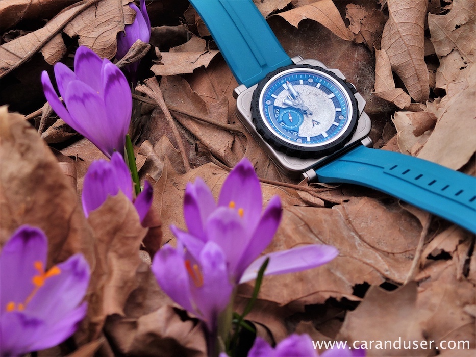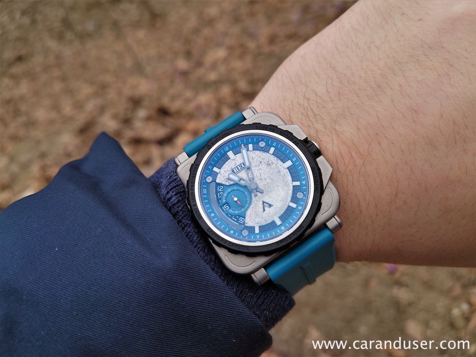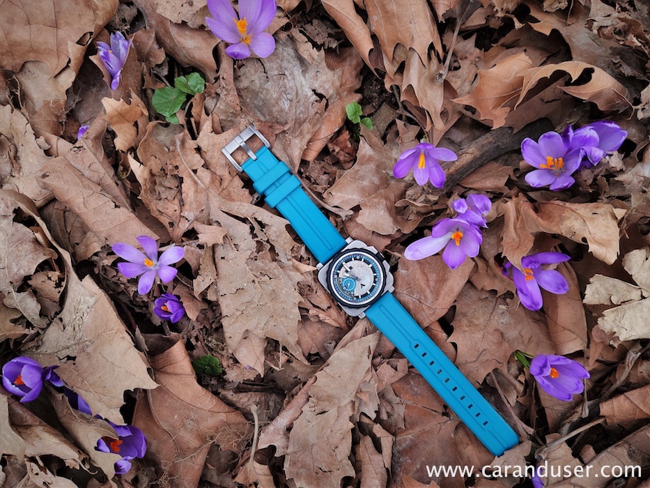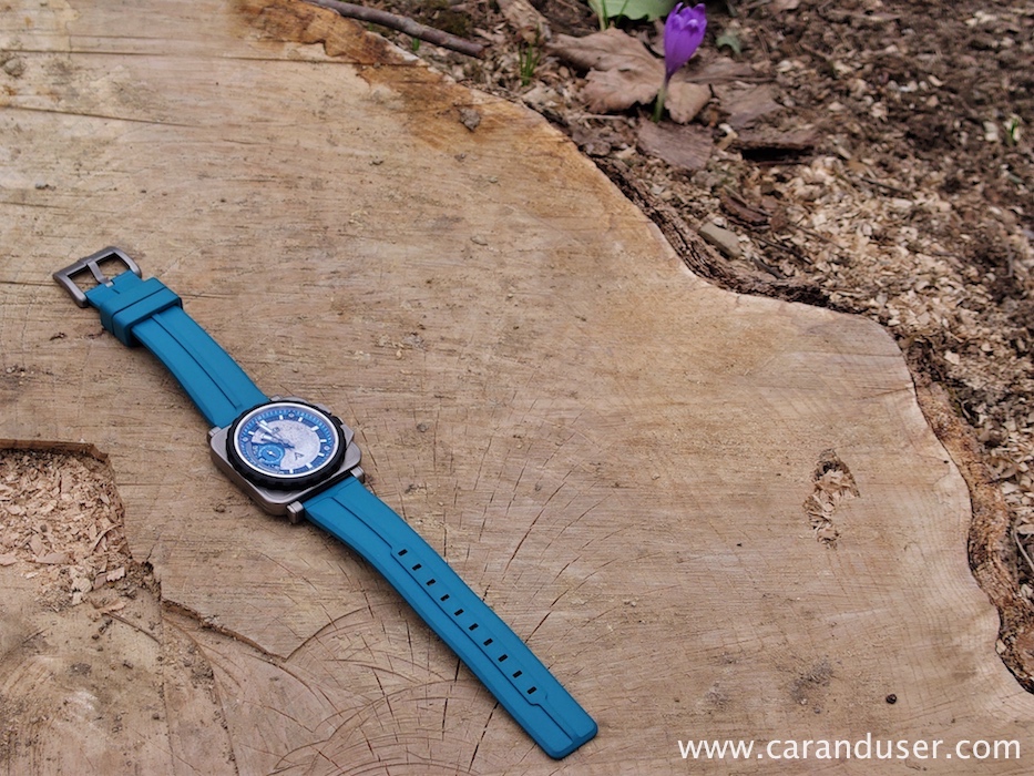 Za razliko od edicije Mustang P-51, ura RNR Akronik lepše sede na in okoli zapestja, kjer ustvari čudovito prezenco. Kljub temu, da dimenzije ohišja niso pretirane, nestandardna kvadratna oblika (prevladujejo okrogle ure) ustreže tudi večjim premerom zapestja. Ne glede na izbiro paščka je nošnja udobna. Na voljo so tri različice – moder ali črn pas iz kavčuka ter zeleni tekstilni pašček. Sistem za hitro menjavo je preprost in učinkovit, zato sem se ga pogosto posluževal. Konec koncev pašček precej spremeni podobo in hkrati tudi namembnost ure. Črn je idealen za v delavnico, moder za poletna potepanja, medtem ko je zelen super modni dodatek za spomladanske ali jesenske dni. Seveda pa obstaja še opcija, da dokupite dve vzmeti, ter pod ohišje napeljete nato pašček.