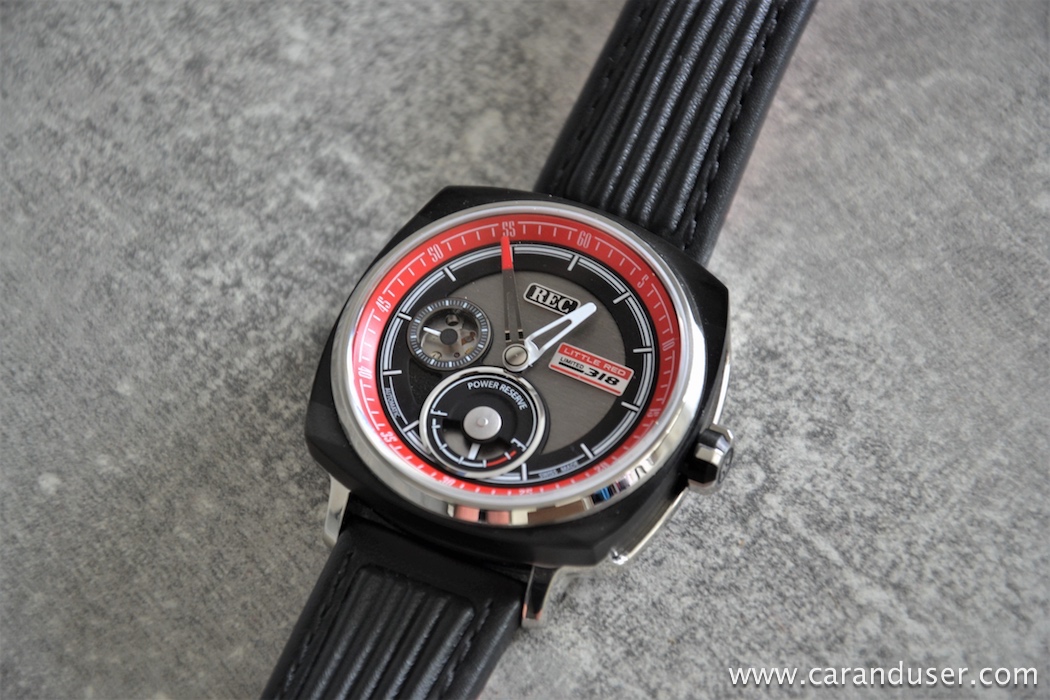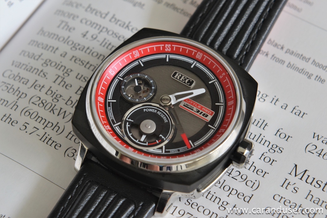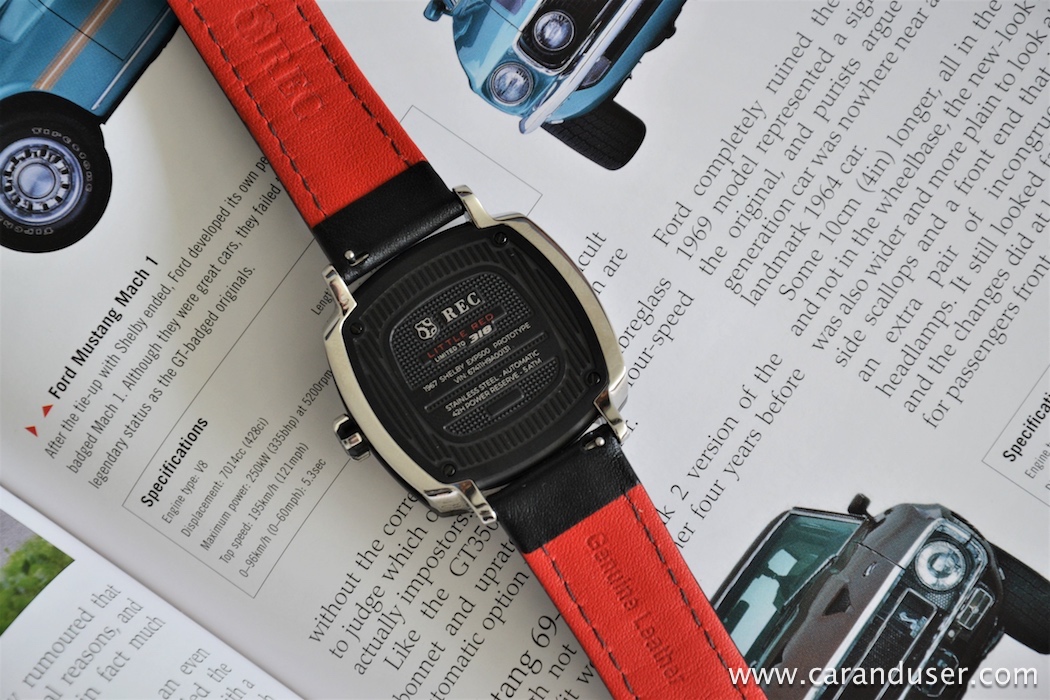 Little Red ponuja rdeče črno kombinacijo, sivo zelena je rezervirana na verzijo Green Hornet. Levi in desni bok ohišja se ponaša z imitacijo sprednjih in zadnjih luči, katerih oblika je vezana na izvedbo Mustanga. Precej domiselna je zasnova krone, ki reprezentira značilno 5-krako aluminijasto platišče, v sredini pa se namesto sikajoče Shelbyjeve kobre nahaja logotip REC Watches.