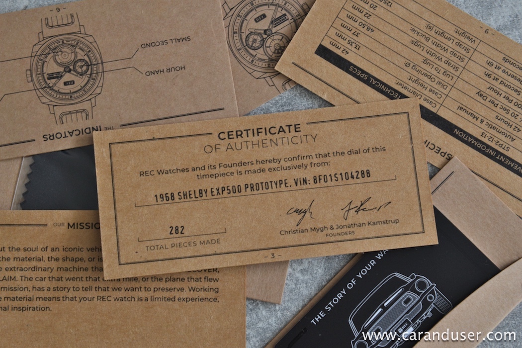 Reciklirana številčnica iz vratne panele najdenega avtomobila je zgolj ena plat celotne zgodbe. Odprtje zanimive kovinske embalaže razkrije pogled na dva interesantna časomera, ki domujeta v reciklirani kartonasti embalaži, v kateri so priloženi reciklirani lističi s kratkimi osnovnimi navodili (podrobnejša na voljo na spletu preko QR kode) in specifikacijami. Ne manjka kartonček s serijsko številko Mustanga – tisti, ki je doniral kovino za številčnico časomera, kateri v sebi skrivata delčke avtomobilistične dediščine.