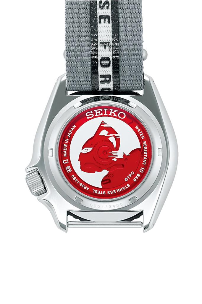Skozi upodobitev Ultramana v rdeči in beli barvi na hrbtni strani, lahko malce ozremo Seikov avtomatski mehanizem, kaliber 4R36, ki ga poznamo iz prejšnjih izdaj kolekcije Seiko 5 Sports. Vstopni mehanizem deluje s frekvenco 21.600 alternanc na uro in lahko polno navit deluje do 41 ur.