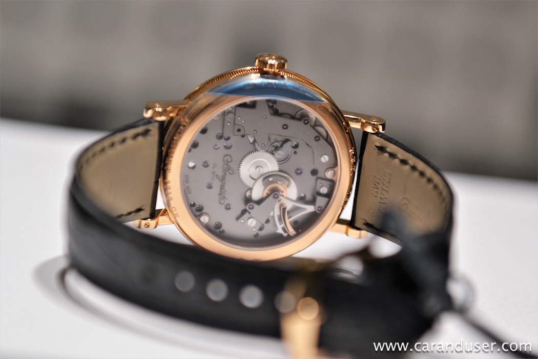 Pod safirnim steklom hrbtne strani nahaja motor znamke Breguet, avtomatski mehanizem kalibra 537/3, opremljen s silikonskim izhodnim kolesom, linijsko švicarsko ročico in vzmetjo. Deluje s frekvenco 3,5 Hz ter ima 45 ur rezerve moči.