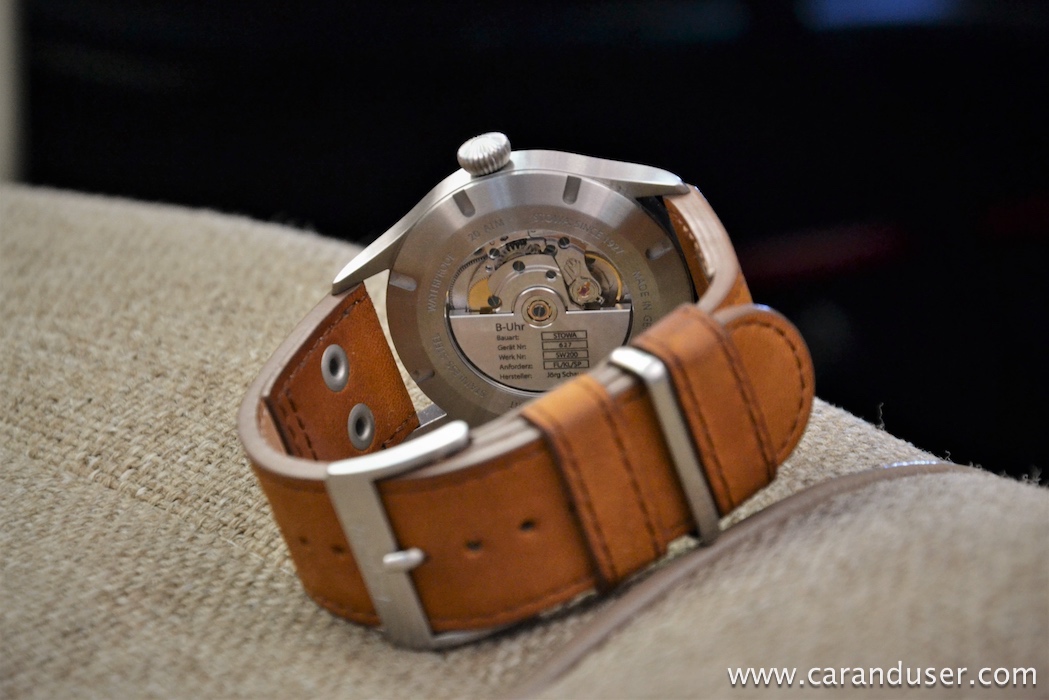 Slednji se nadaljuje na enostavno pregledni številčnici tipa B, ki je brez datuma ali omembe proizvajalca, namenjena eni sami funkciji. Prikazu časa. Le-tega vestno prikazuje tudi ob slabših svetlobnih pogojih oziroma popolni temi, saj so številke, indikatorji in kazalci vključno s sekundnim, konkretno premazani z luminiscenčnim nadevom. In če je zgodnji del namenjen funkciji, se spodaj skriva malo modernega pristopa. Stowa je na hrbtno stran namestila safirno steklo, skozi katerega je moč ozreti predelan ETA avtomatski mehanizem s hišnim rotorjem, ki vsebuje gravuro specifikacij, medtem ko premore shraniti do 38-ur energije navitja.