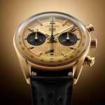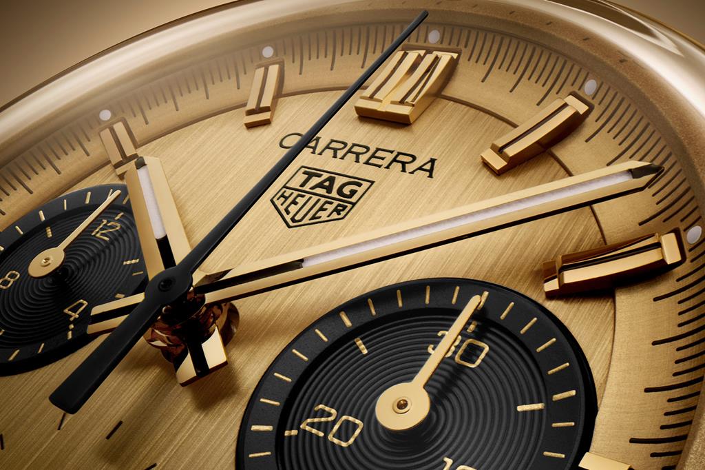 Zlata Carrera prav tako povzema retro pridih in se oblikovno navezuje na modele iz sedemdesetih let prejšnjega stoletja. To pomeni, da se nad številčnico razprostira mogočen safirni kristal, ki ustvari tako imenovani ‘Glassbox’. Posledično se fiksna luneta s tahimetrično skalo nahaja pod steklom in se kot taka drži osrednjega dela številčnice.