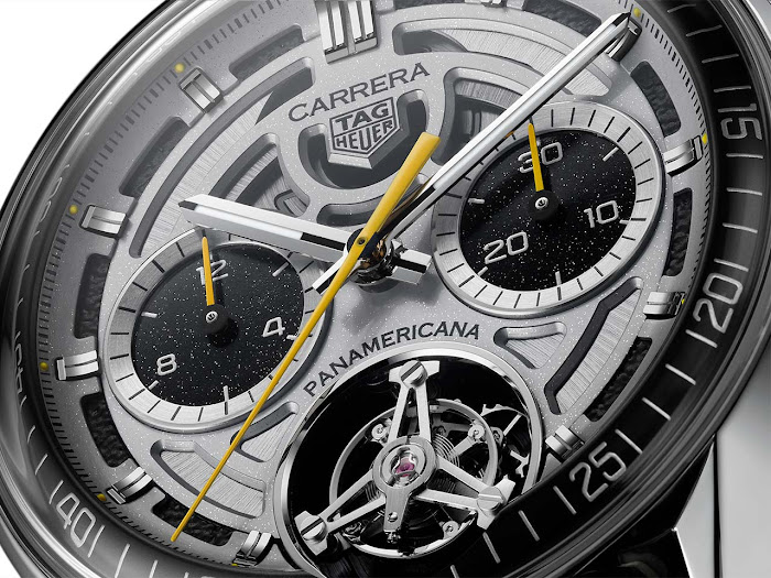 Tag Heuer Carrera Chronograph Tourbillon x Porsche Panamericana se oblikovno zgleduje po kultnem dirkalniku Porsche 550 Spyder. Skeletna številčnica ima zapletene podrobnosti, ki odražajo kolesa dirkalnika 550 Spyder. Barvna shema – srebrna, rumena in črna – odraža originalno poslikavo tega dirkalnika.