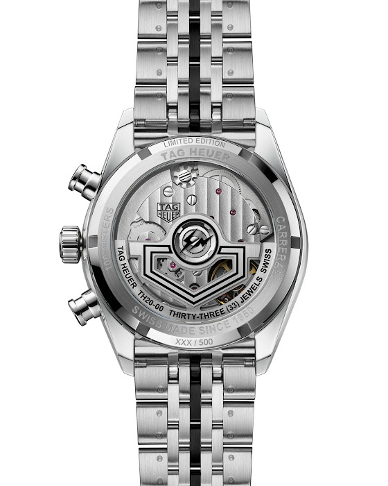Okoli roba zadnje strani ohišja je vgraviran venec zmage, ki spominja na zlato dobo Formule 1. Navdih je oblikovalec črpal iz tradicije Jacka Heuerja, ki je nadarjenim in uspešnim dirkačem podarjal zlato uro kot talisman za srečo, s čimer je venec zmage postal simbol uspeha. TAG Heuer Carrera Chronograph x fragment Limited Edition, ref. št. CBS221B.BA0045, je omejena naklada na 500 oštevilčenih primerkov s priporočeno maloprodajno ceno 8.150 evrov.