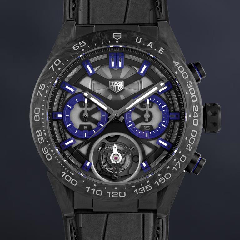 Moč v kazalce prihaja iz hišnega avtomatskega mehanizma, kaliber Heuer 02T, katerega dodatek T kaže na komplikacijo tourbillona. Mehanizem vsebuje 33 draguljev, deluje s frekvenco 28.800 alternanc na uro in zagotavlja do 65 ur avtonomije, ko je popolnoma navit. Unikatnost izdaje popestri hrbtna stran ohišja z gravuro znamenitih nebotičnikov Dubaja.