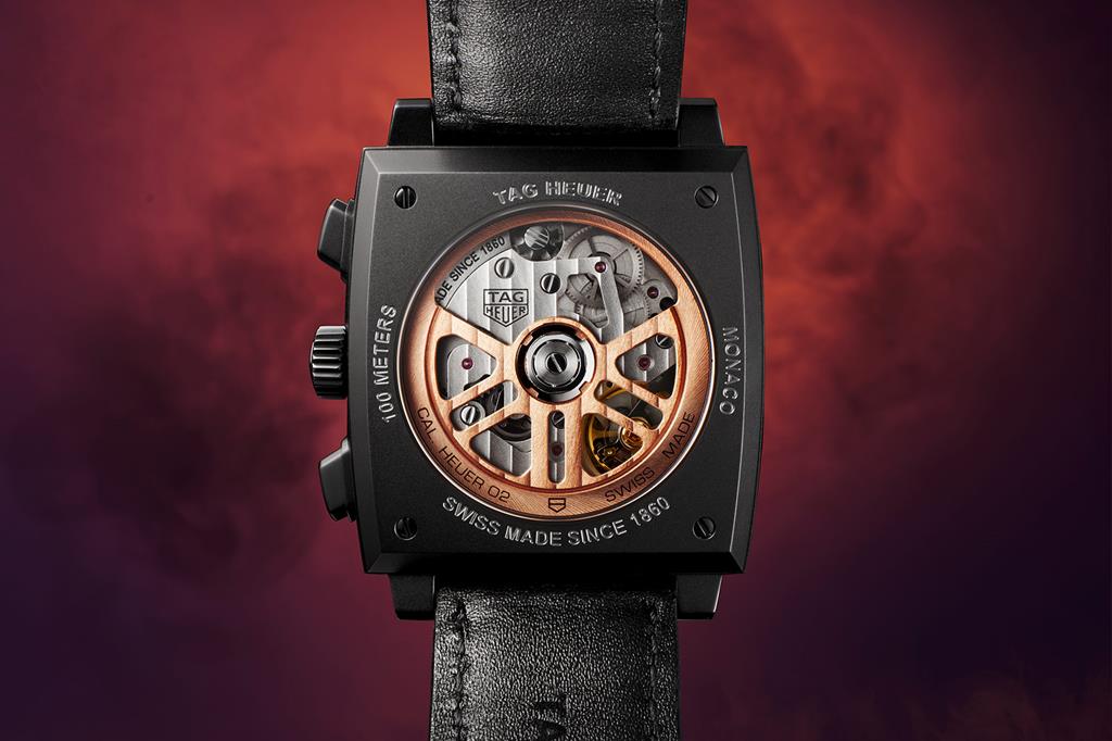 Skozi safirno steklo hrbtne strani ohišja je viden hišni avtomatski mehanizem kronografskega tipa, kaliber Heuer 02. Odlikuje ga skeletni rotor iz rožnatega zlata in impresivna 80-urna rezerva energije navitja.