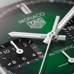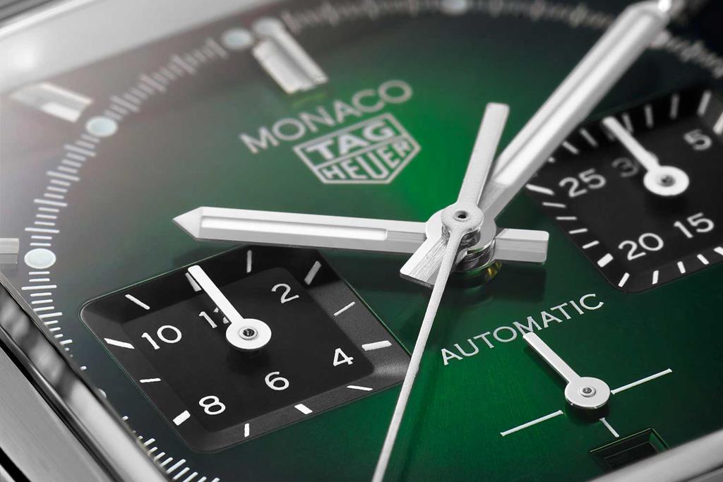 Uro iz boksov bomo prepoznali po kvadratnem ohišju iz nerjavečega jekla z dimenzijami 39 mm x 39 mm. Zaznamuje ga višina 15 mm s kupolastim safirnim kristalom in kombinacijo poliranih ter brušenih površin ohišja. Tisto, zaradi česar je ta Monaco poseben, je njegova gradientna zelena številčnica. Zanašajoč se na trenutno najbolj vročo barvo v urarstvu, TAG Heuer predstavlja smaragdno zeleni ton s sončno brušenim vzorcem in degradiranim učinkom, kjer se robovi številčnice postopoma spreminjajo v temno zeleno (skoraj črno) barvo.