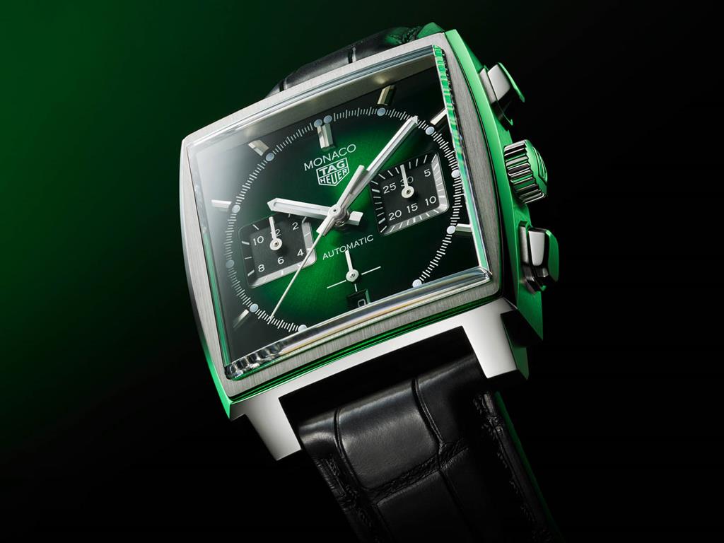 Uro iz boksov bomo prepoznali po kvadratnem ohišju iz nerjavečega jekla z dimenzijami 39 mm x 39 mm. Zaznamuje ga višina 15 mm s kupolastim safirnim kristalom in kombinacijo poliranih ter brušenih površin ohišja. Tisto, zaradi česar je ta Monaco poseben, je njegova gradientna zelena številčnica. Zanašajoč se na trenutno najbolj vročo barvo v urarstvu, TAG Heuer predstavlja smaragdno zeleni ton s sončno brušenim vzorcem in degradiranim učinkom, kjer se robovi številčnice postopoma spreminjajo v temno zeleno (skoraj črno) barvo.