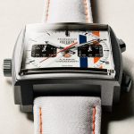 Izstopa dizajn številčnice z belo podlago, vzdolžna grafika podjetja Gulf in starinski logotip podjetja kakor tudi blagovne znamke Heuer. Prezenco na zapestju bo poudaril sovpadajoči bel tekstilni pašček z oranžnimi šivi. Kompletu pa je dodan še modri usnjeni pašček, dirkaško naluknjan za zračenje. Priporočljiva prodajna cena Tag Heuer Monaco Chronograph x Gulf znaša 9.500 evrov.