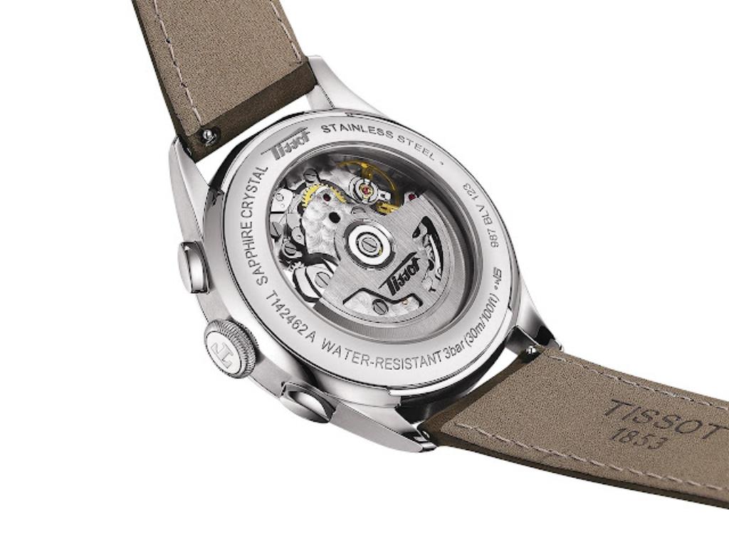 Obrat ure za 180° razkrije švicarski avtomatski ETA, kaliber Valjoux A05.231, ki je viden skozi safirni kristal. Bije pri 28.800 alternancah na uro in ima rezervo moči do 68 ur. Kronografski mehanizem z odmično ročico vsebuje tudi uravnoteženo vzmet Nivachron ter stilsko zasnovan rotor Tissot Heritage.