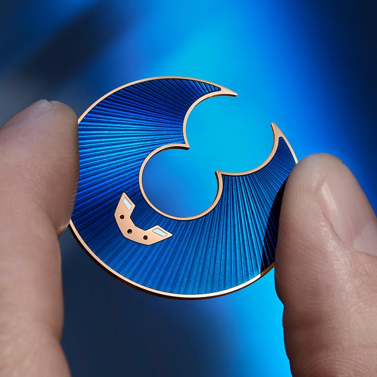 Vrtiljak, ki se ujema s tradicionalnimi kazalci, kaže čas s kazalcema za ure in minute. Svojevrsten čar ustvari še izjemno lahko in veliko silicijevo ravnotežno kolo. Indikatorji ur so vgrajeni v veliko zunanje zobniško kolo, ki služi kot vodilo vrtiljaka. Za kontrast so povezovalni zobniki izdelani iz rožnatega zlata.