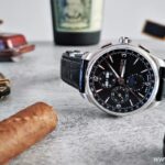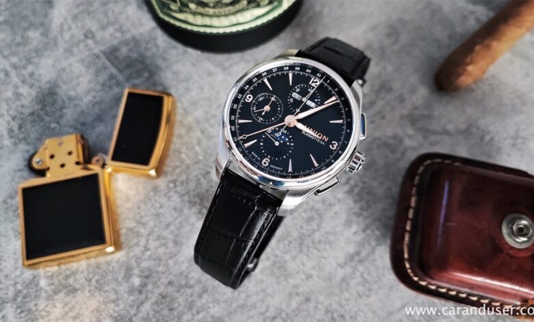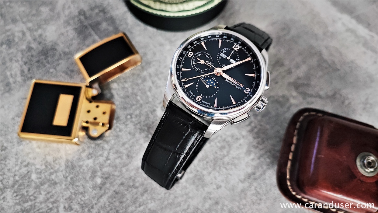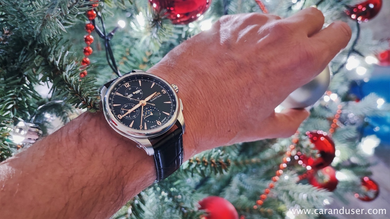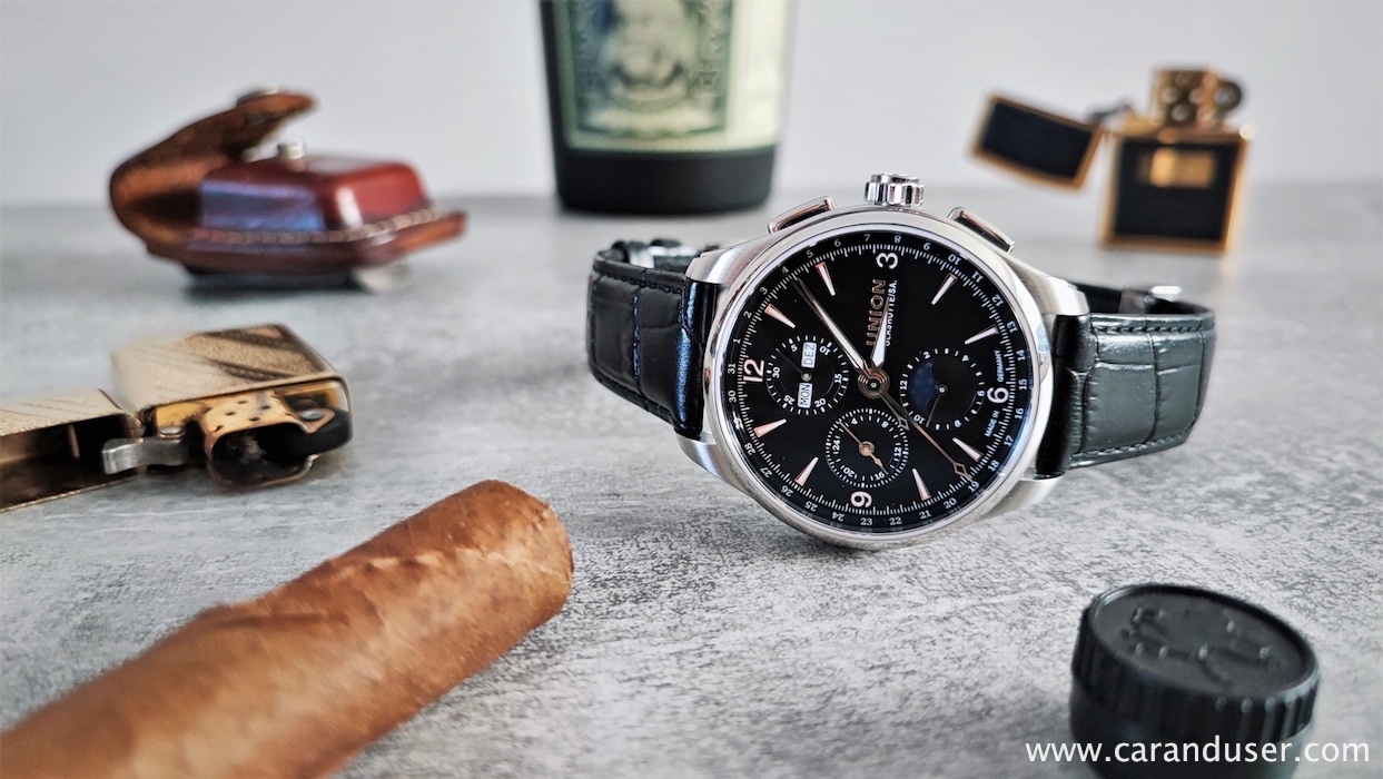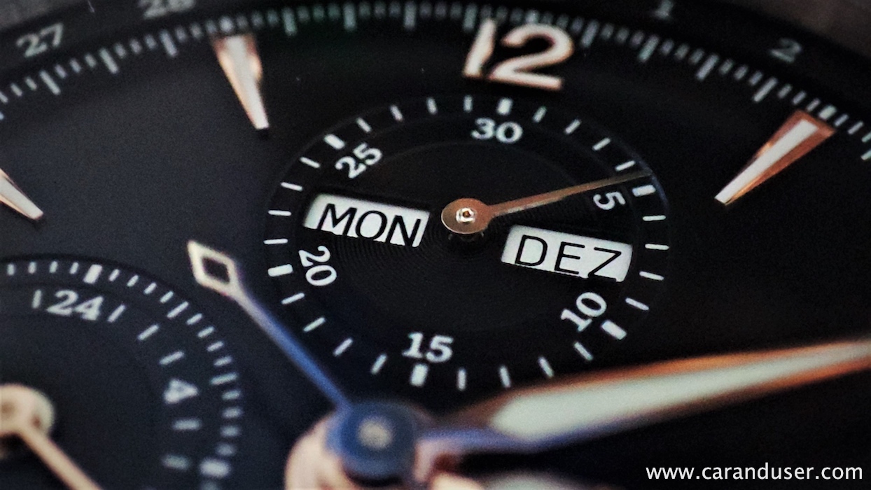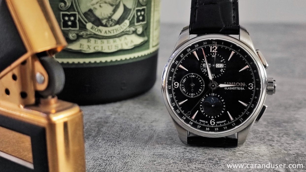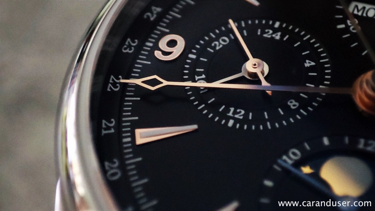 Union Glashütte Belisar Chronograph Moon Phase je ura v pomenu besede. Uretina! Po svojem zunanjem izgledu se lahko primerja z Longines Master Collectionom ali Breitlingom Navitimer Montbrillantom.