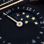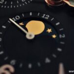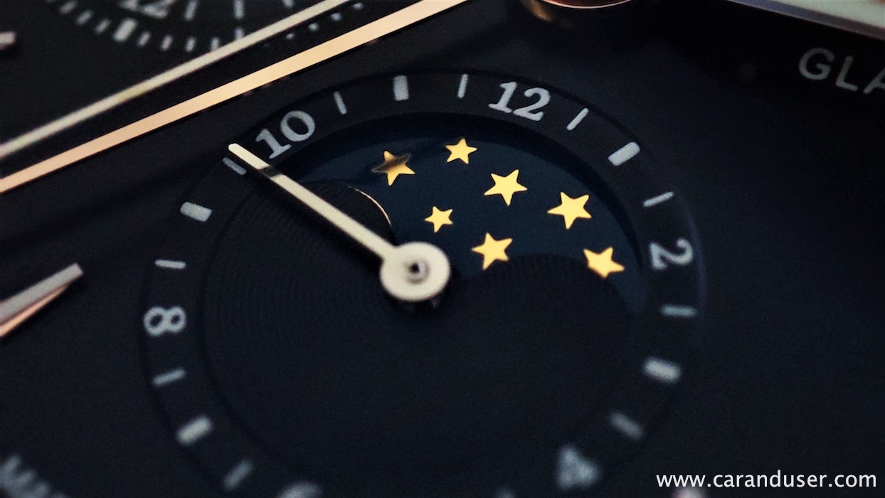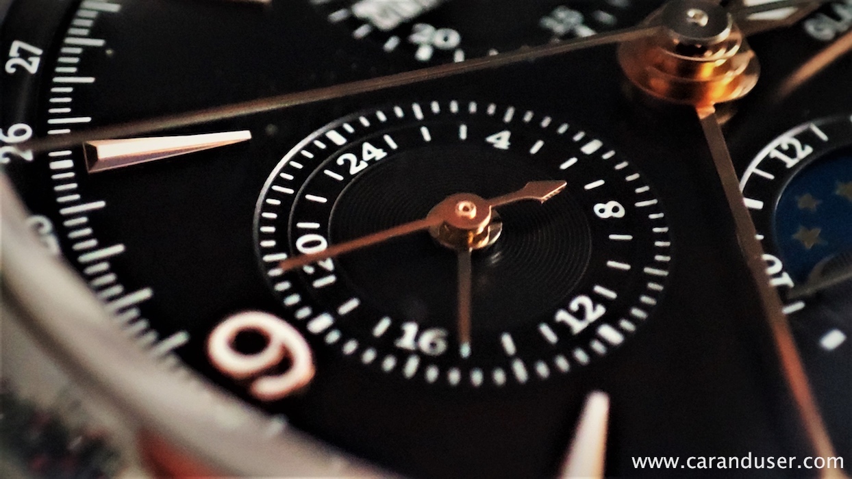 | Številčnica | Črna lakirana številčnica s kazalci in indikatorji ur v odtenku rožnatega zlata; ob robu številčnice v krogu nanizanih 31 dni; prikaz dneva, meseca in 30-minutni števec kronografa ob 12. uri; števec tekočih sekund ter 24-ur ob 9 uri; števec ur funkcije kronografa z insertom luninih men ob 6. uri |