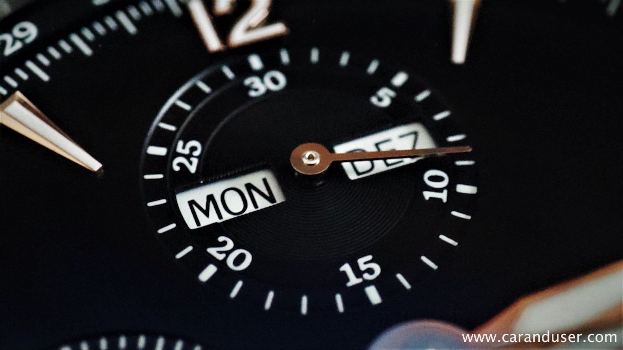 Prefinjena črna številčnica z odetimi kazalci in indikatorji v odtenek rožnatega zlata, prikazuje vrsto informacij. Okoli roba so razporejene številke od 1 do 31, ki služijo retrogradnemu prikazu dneva v mesecu s pomočjo kazalca z polmesečno konico. Sledijo tri podštevilčnice. Funkcije kronografa, poleg sekund osrednjega kazalca, prikazujeta 12-urni števec nad 6. uro in 30-minutni števec pod 12. uro.