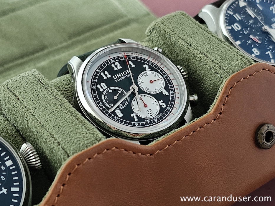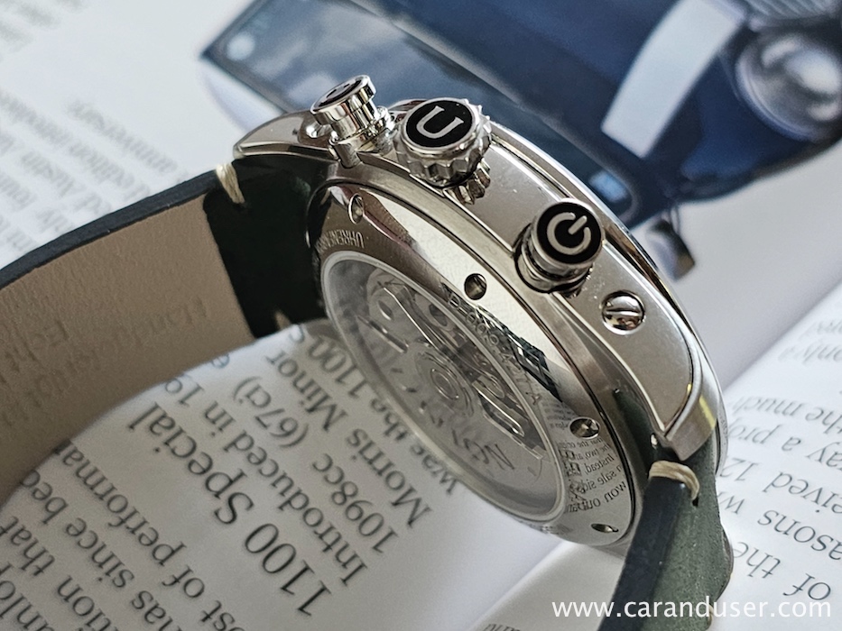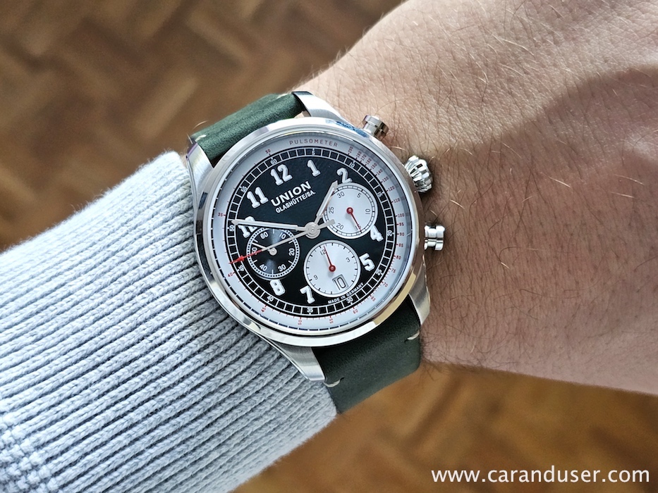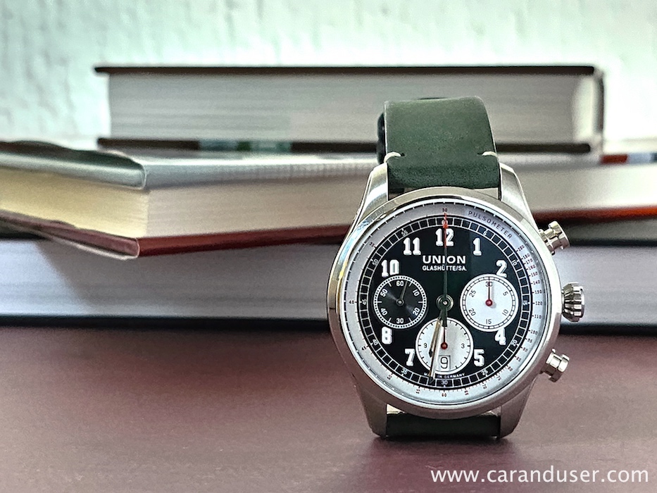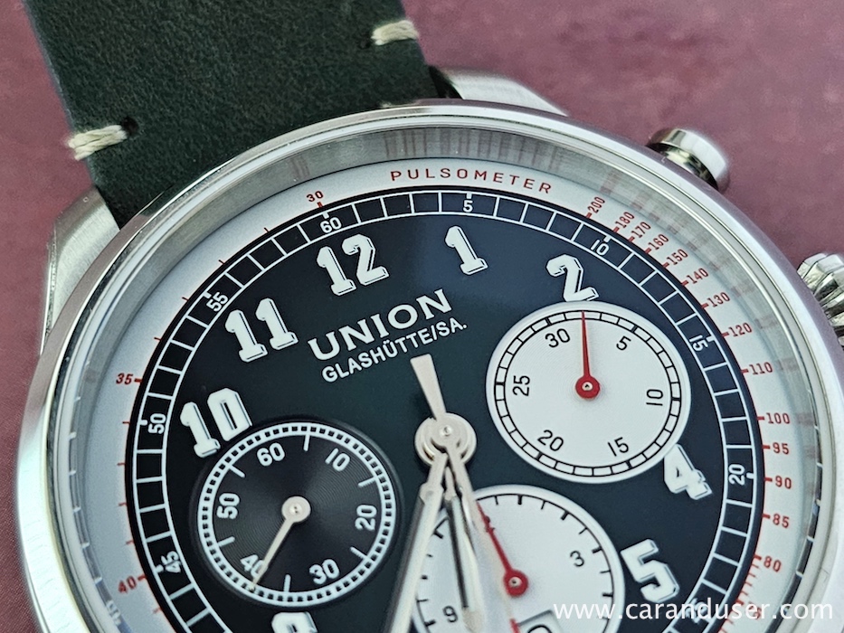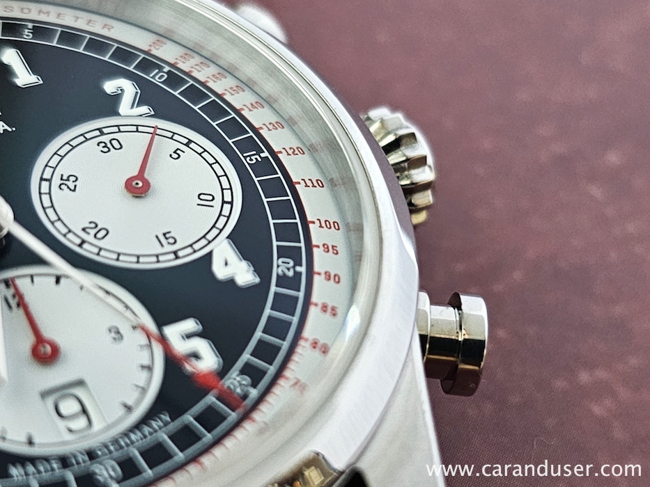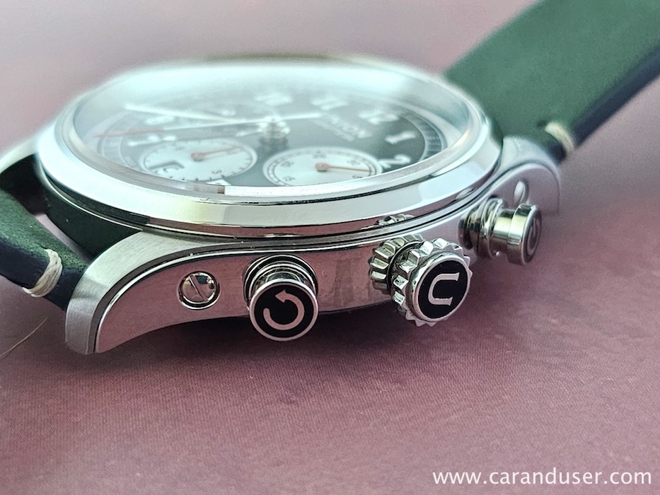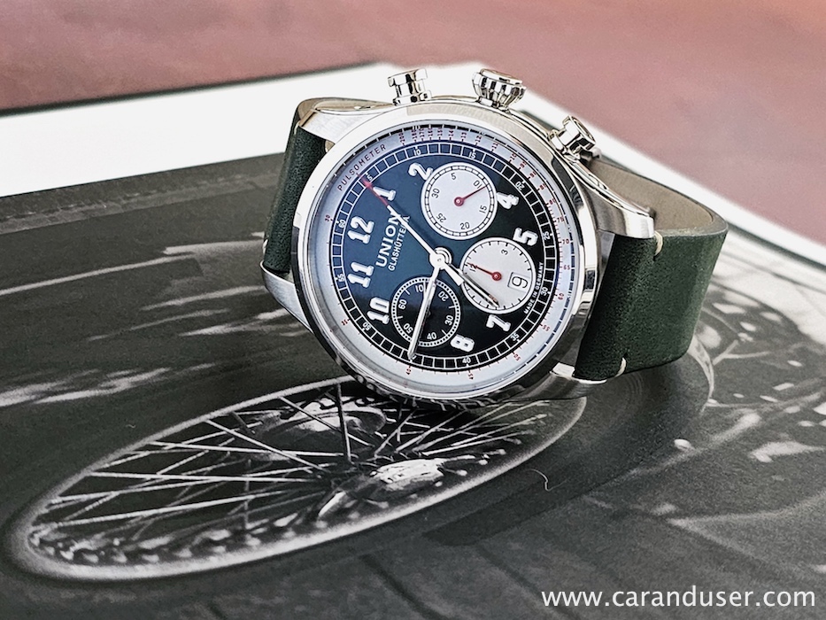 Gumbi kronografa so oblikovani v stilu motornih valjev, krona pa deluje kot diamant z nagubanim robom za boljši oprijem. Antirefleksno safirno steklo nad številčnico je rahlo zaobljeno, kar potencira retro pridih, sama številčnica pa vas bo osupnila. Medtem ko mnogi proizvajalci lansirajo ”ziheraške” izdaje, so vzhodno-nemški mojstri šli izven cone udobja, ter številčnico kronografa oplemenitili s prelivajočo se zeleno barvo. Slednja spomni na britansko zeleno dirkaško barvo ali obarvano karoserijo markantnega Forda Mustanga kot tudi Porscheja 911 v irsko zeleni barvi. Dejstvo je, da je možnih ogromno avtomobilističnih interpretacij.