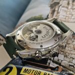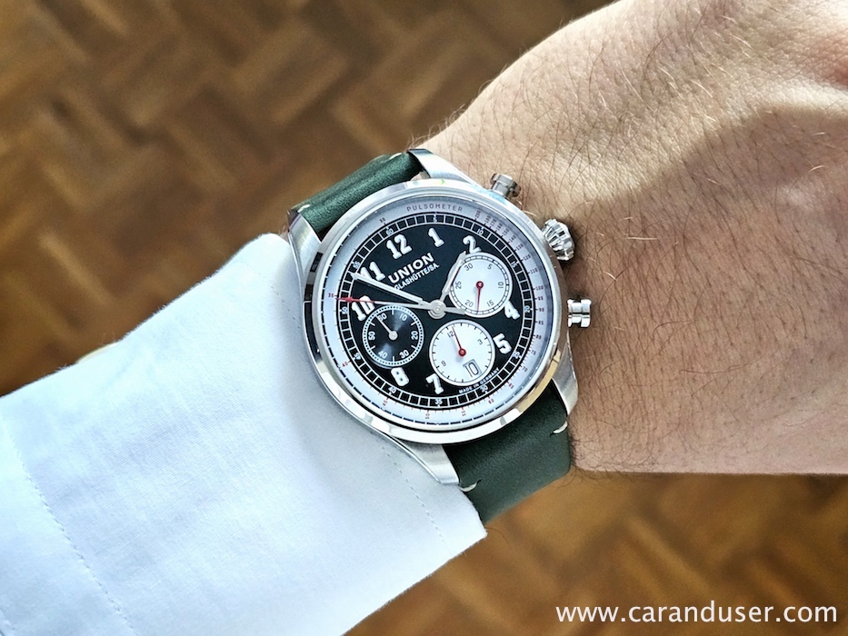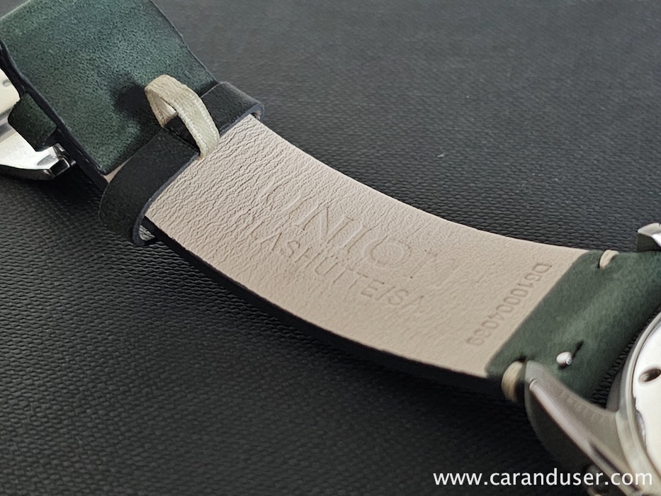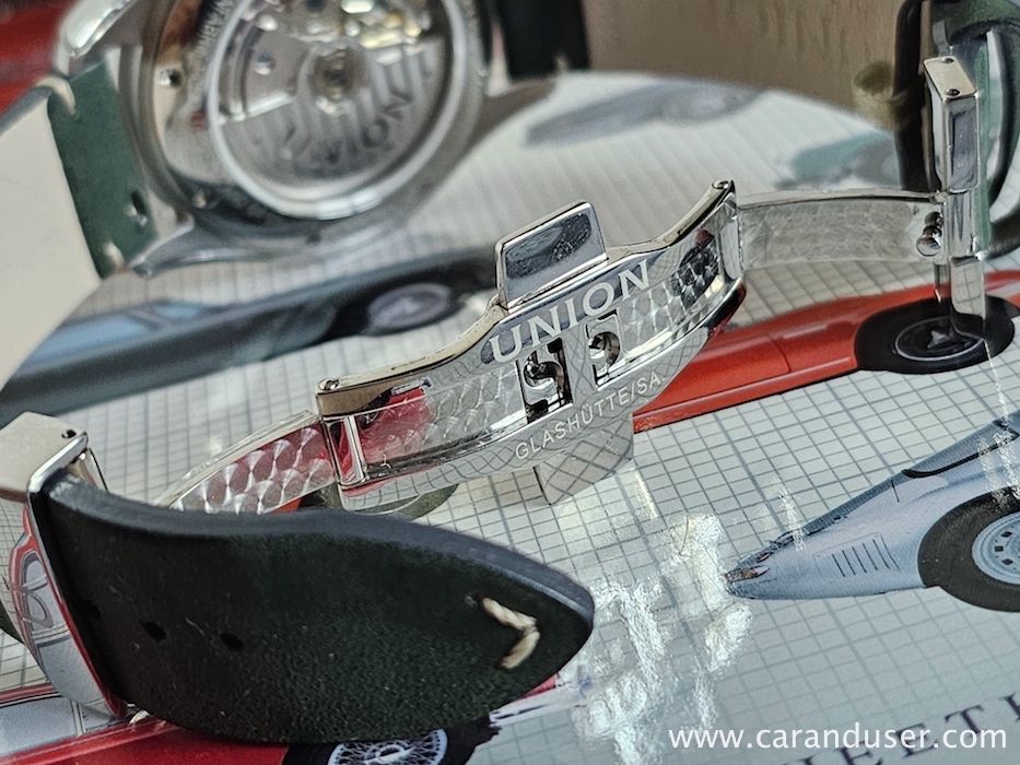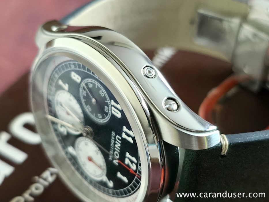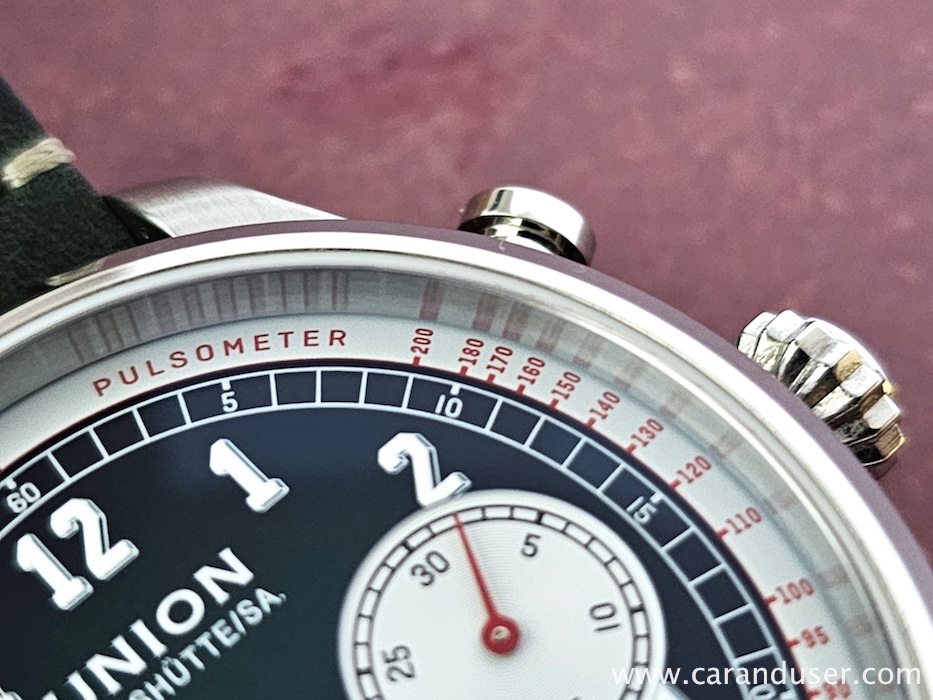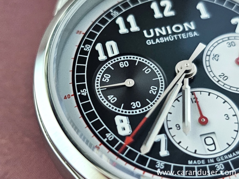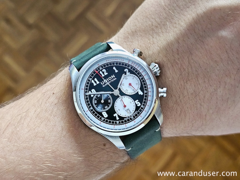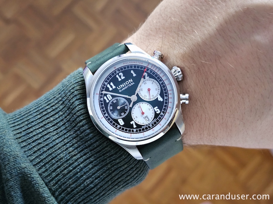 Gumbi kronografa so oblikovani v stilu motornih valjev, krona pa deluje kot diamant z nagubanim robom za boljši oprijem. Antirefleksno safirno steklo nad številčnico je rahlo zaobljeno, kar potencira retro pridih, sama številčnica pa vas bo osupnila. Medtem ko mnogi proizvajalci lansirajo ”ziheraške” izdaje, so vzhodno-nemški mojstri šli izven cone udobja, ter številčnico kronografa oplemenitili s prelivajočo se zeleno barvo. Slednja spomni na britansko zeleno dirkaško barvo ali obarvano karoserijo markantnega Forda Mustanga kot tudi Porscheja 911 v irsko zeleni barvi. Dejstvo je, da je možnih ogromno avtomobilističnih interpretacij.