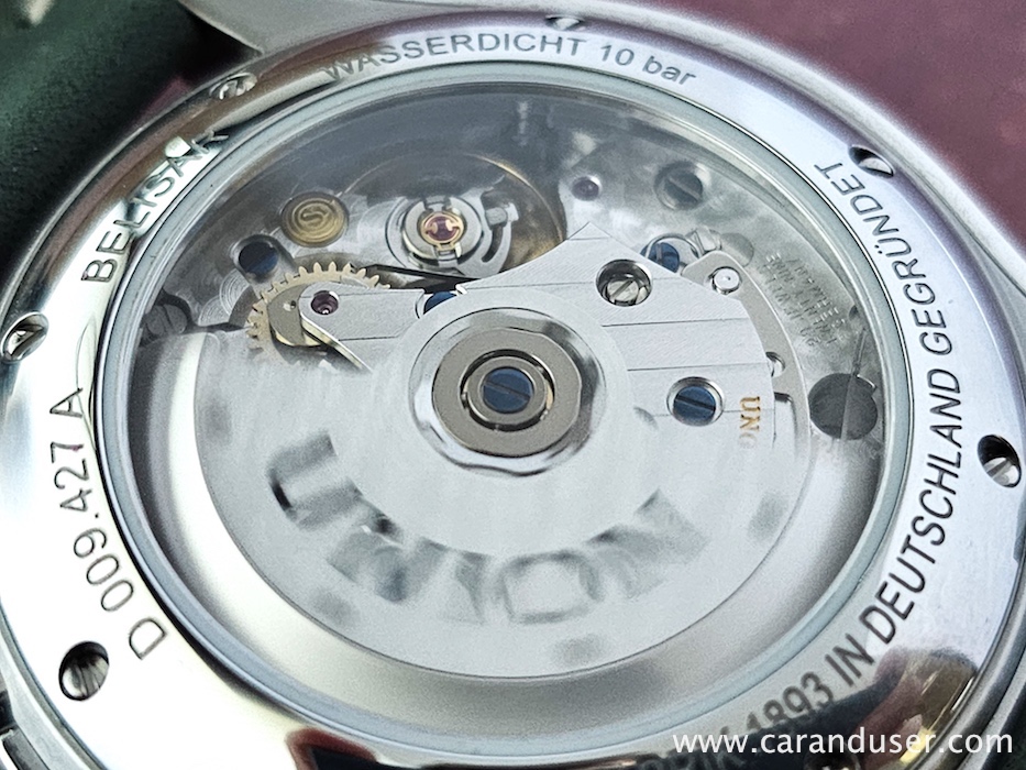 Za ljubitelje mehanike je pogled na delovanje mehanizma svojevrstna pornografija, zato je razstavno steklo hrbtne strani ohišje perfekten dodatek. Skozenj je moč ozreti avtomatski mehanizem, kaliber UNG.27.01, ki nudi do 65 ur energije navitja. Tiktaka z 28.800 alternancami na uro in je opremljen s silikonsko uravnoteženo vzmetjo, zaradi česar je mehanizem manj občutljiv na magnetna polja in temperaturna nihanja. Večno vprašanje, ali je dovolj zaloge energije? Je, in če se ustavi, jo ponovno naviješ, s čemer se ustvari dodaten stik z uro.
