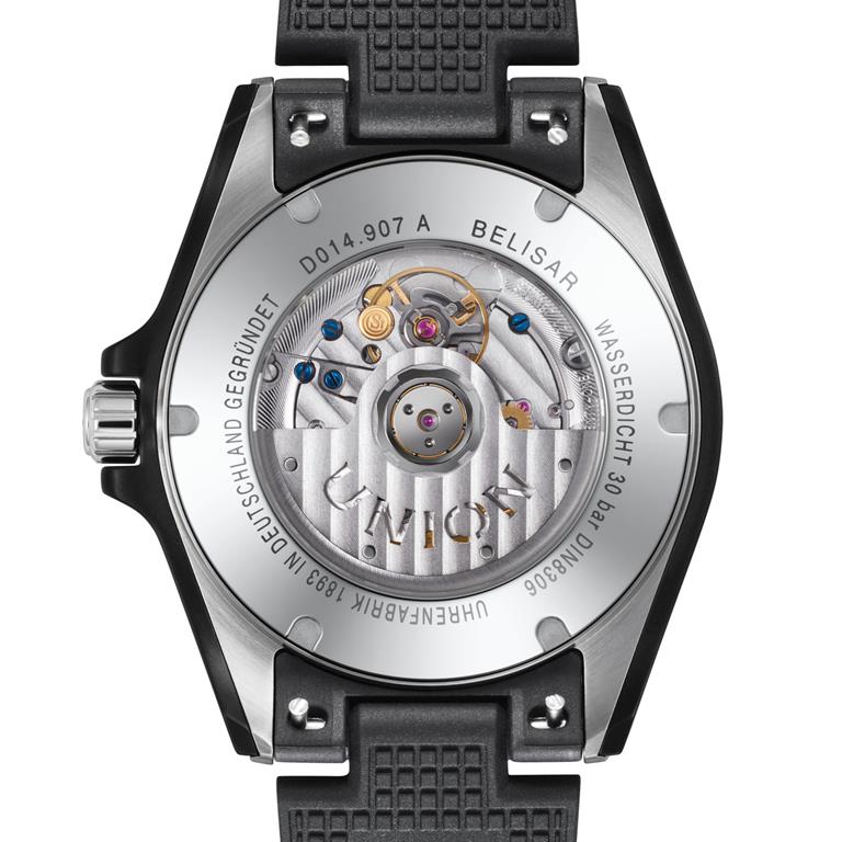 Na privitem zadnjem delu ohišja je safirno steklo, ki razkriva avtomatski mehanizem, kaliber UNG-07.S1. Ta ima silikonsko vzmet za uravnoteženje, ki mehanizem ščiti pred magnetnimi polji, temperaturnimi nihanji in udarci. Rotor, ki ga krasijo črte Glashütte in napis UNION, prenaša energijo v cilinder ter zagotavlja do 60 ur rezerve energije navitja.