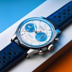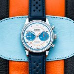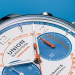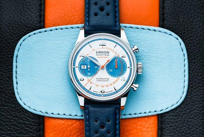 Modri usnjeni pašček v rally videzu ima kontrastne črte svetlo modre in oranžne barve, ki se ujemajo s toni številčnice. Dvojno zložljiva zaponka z varnostnimi potisnimi deli pritrdi uro na zapestje. Kronograf Union Glashütte Noramis Sachsen Classic 2024, z ref. št. D012.427.16.017.09, je omejena serija na 350 primerkov z maloprodajno ceno 3.600 evrov.