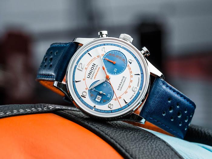 Modri usnjeni pašček v rally videzu ima kontrastne črte svetlo modre in oranžne barve, ki se ujemajo s toni številčnice. Dvojno zložljiva zaponka z varnostnimi potisnimi deli pritrdi uro na zapestje. Kronograf Union Glashütte Noramis Sachsen Classic 2024, z ref. št. D012.427.16.017.09, je omejena serija na 350 primerkov z maloprodajno ceno 3.600 evrov.