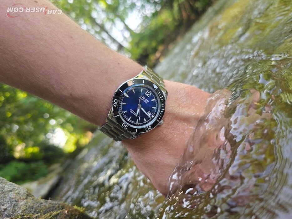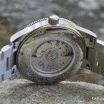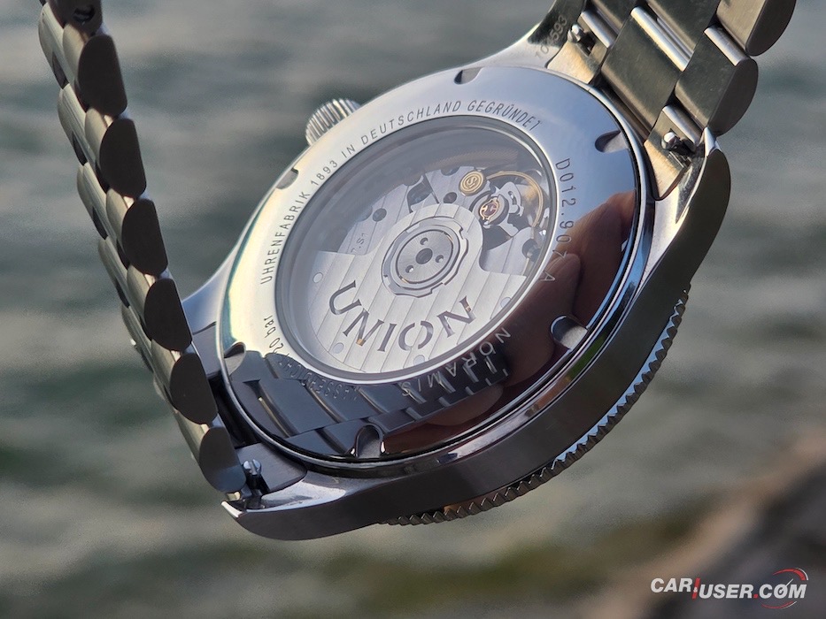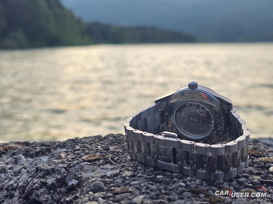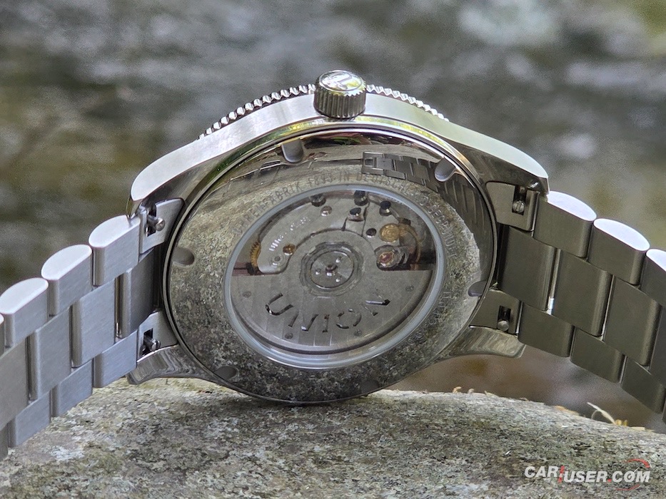 Skozi hrbtno stran je moč ozreti predelan rotor avtomatskega mehanizma, kaliber UNG-07.SI, ki deluje frekvenco 25.200 alternanc na uro in ima robustno 60-urno rezervo energije navitja. Slednje je češnja na torti za nekoga, ki išče svojo prvo pravo uro. Mehansko. Redke so potapljaške ure, ki razkazujejo svoje srce. Pravzaprav je za 2.550 evrov težko najti model, ki bi poleg safirnega stekla na hrbtni strani ponujal še kvalitetno obdelavo zaključkov mehanizma.
