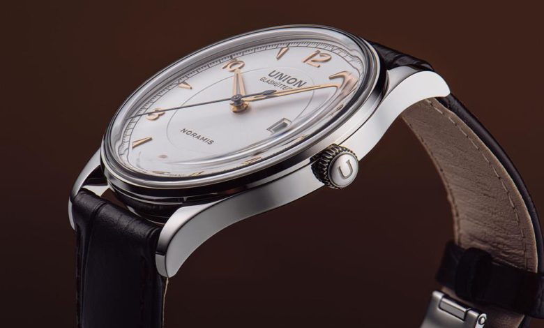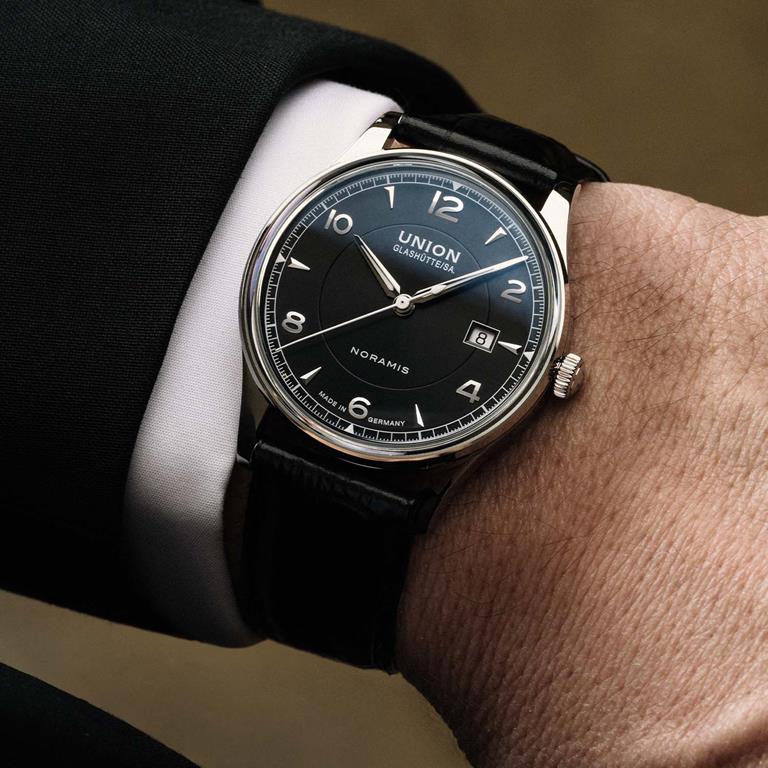 Elegantna zapestna ura Union Glashütte Noramis Date, v kombinaciji s paščkom iz črnega ali rjavega telečjega usnja s krokodiljim vzorcem, se ceni na 2.400 evrov.
