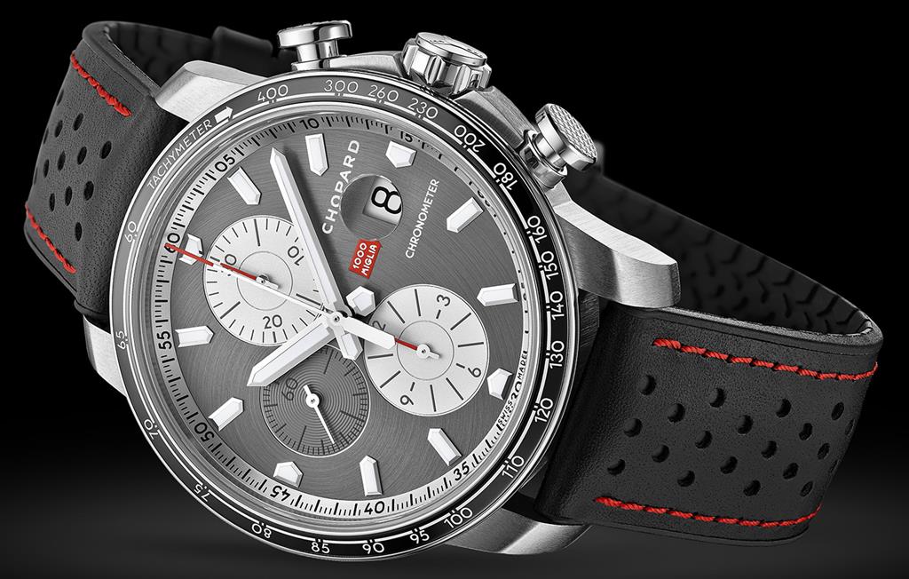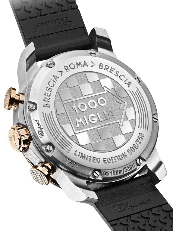 Ljubitelji bencinskih hlapov bodo pozdravili gumbe kronografa zasnovane v stilu ”batov” ter krono z odtisom volanskega obroča. Zadnjo stran ohišja obdaja pokrov z gravuro logotipa dirke ter številko ure iz omejene serije. Pri tem ne gre zanemariti, da ohišje omogoča do 100 metrov vodotesnosti. Na sivi številčnici s krožno brušenimi vzorci izstopata bela števca kronografa, datum ob 3.uri ter rdeč logotip 1000 Miglia.
