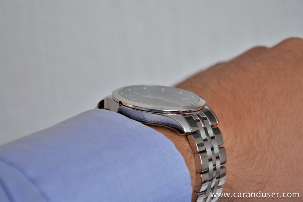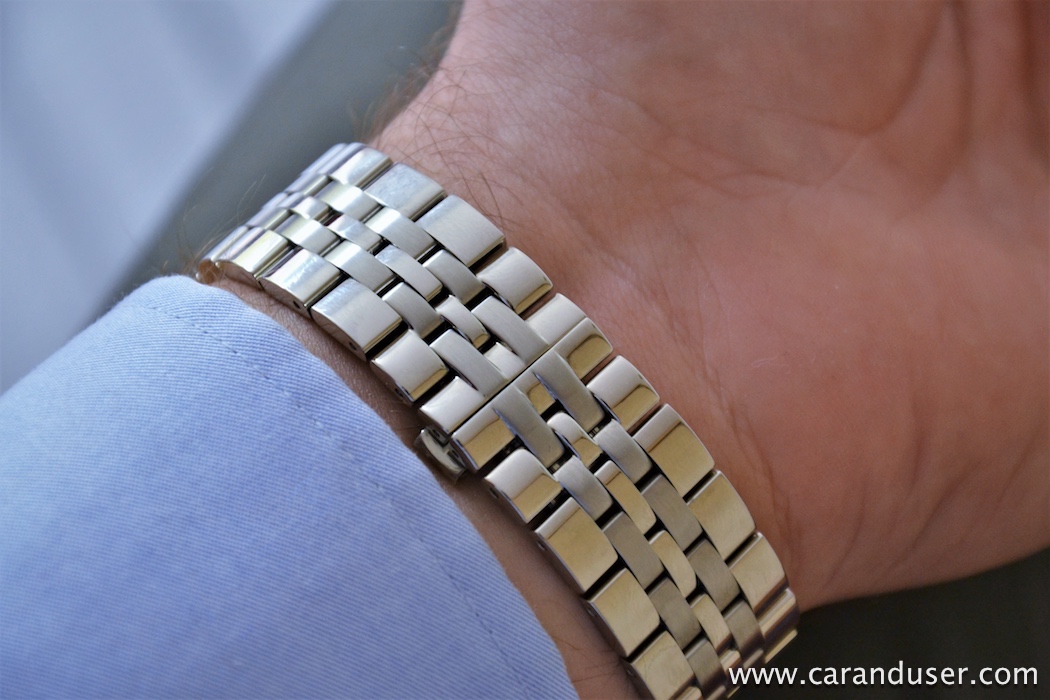 Med preizkušanjem me je impresionirala kovinska zapestnica s petimi členi, saj daje kompakten občutek, in enako velja za zaponko v obliki metulja, ki dobro deluje in doda fini pridih snemanju ter nameščanju ure na zapestje.