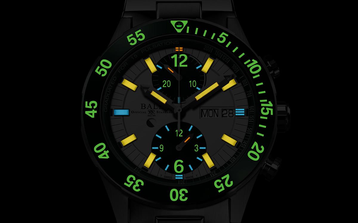 Na ohišju sedi keramična luneta odeta v zeleno barvo. Na njej je vtisnjena 60-minutna skala, ki tudi sveti v temi, kakor številni elementi na časomeru. Pri Ballu se lahko pohvalijo s posebno svetilnostjo, ki ne zahteva izpostavljenosti sončni svetlobi. Ta po približno 20 minutah lahko začne bledeti, kar pa ni ravno priročno za reševanje. Namesto tega je Ball v uro vgradil ”mikro plinske cevi”, katere zagotavljajo stalen sijaj, ki ohranja svojo svetlost od prve sekunde teme do zadnje. Proizvajalec garantira vsaj 10 let delovanja tega sistema.