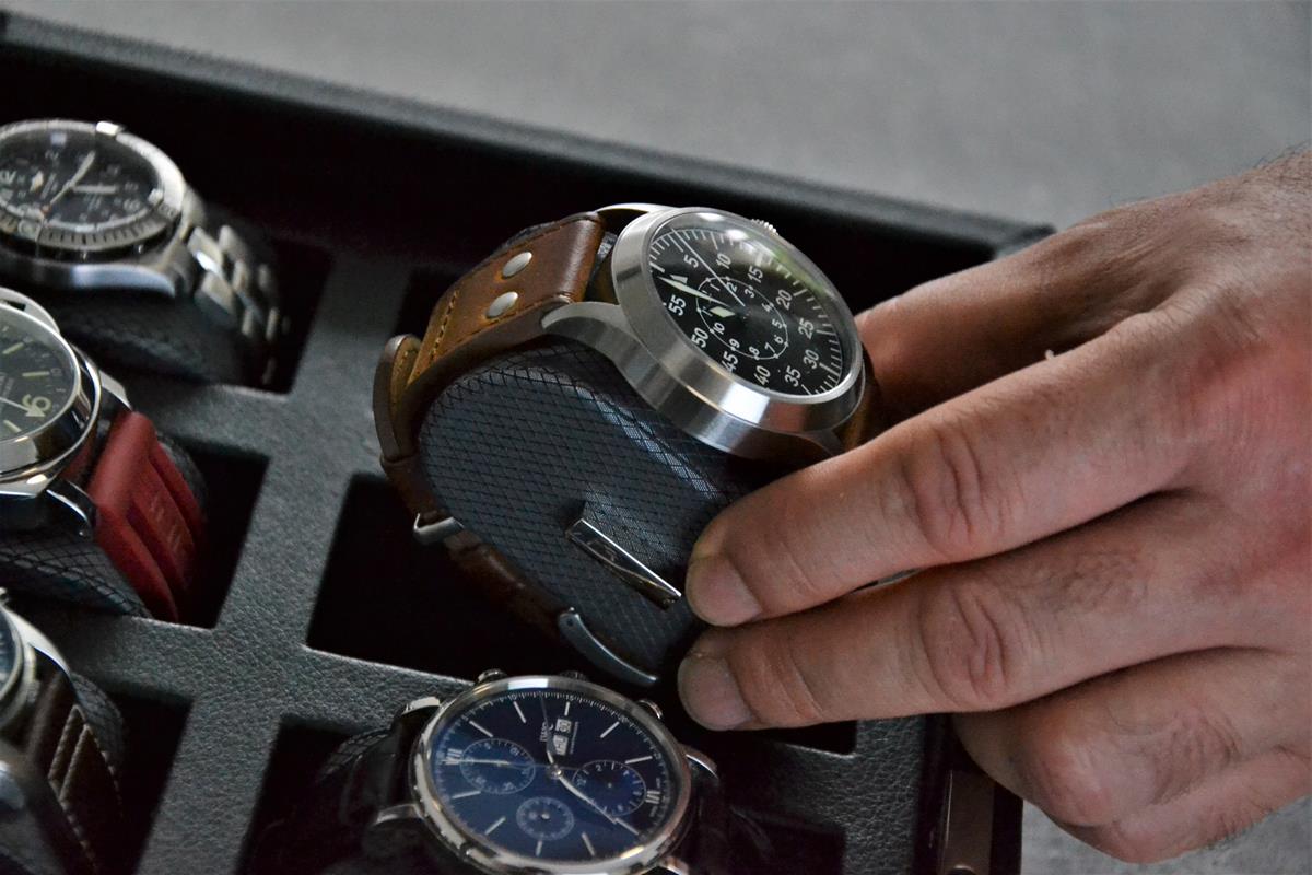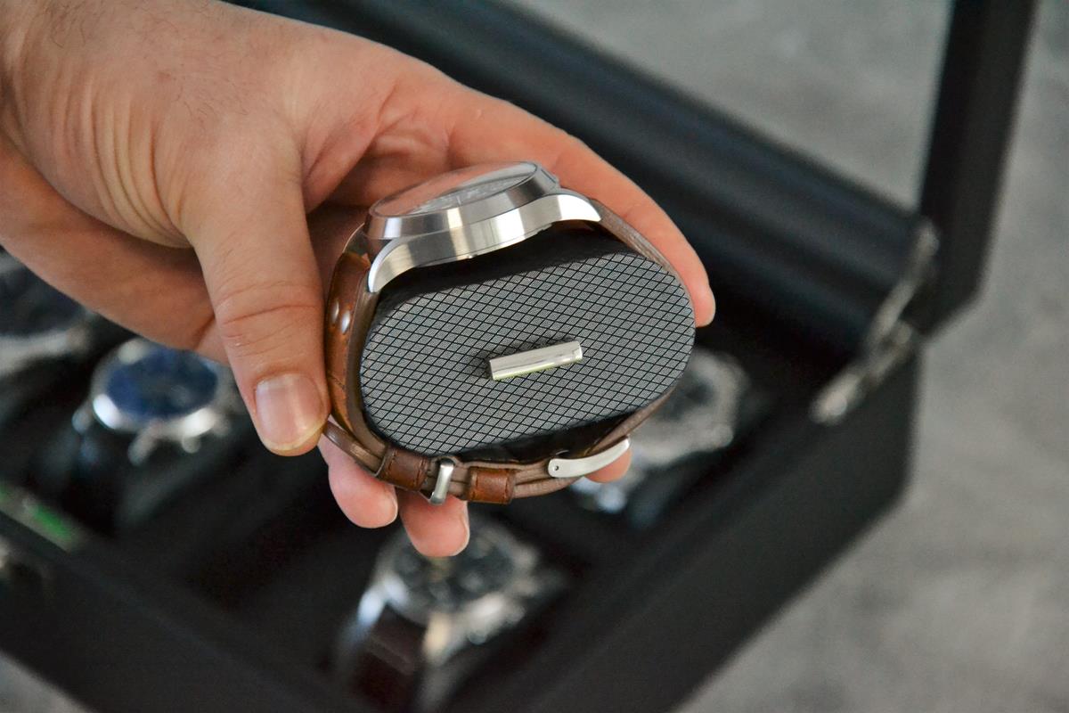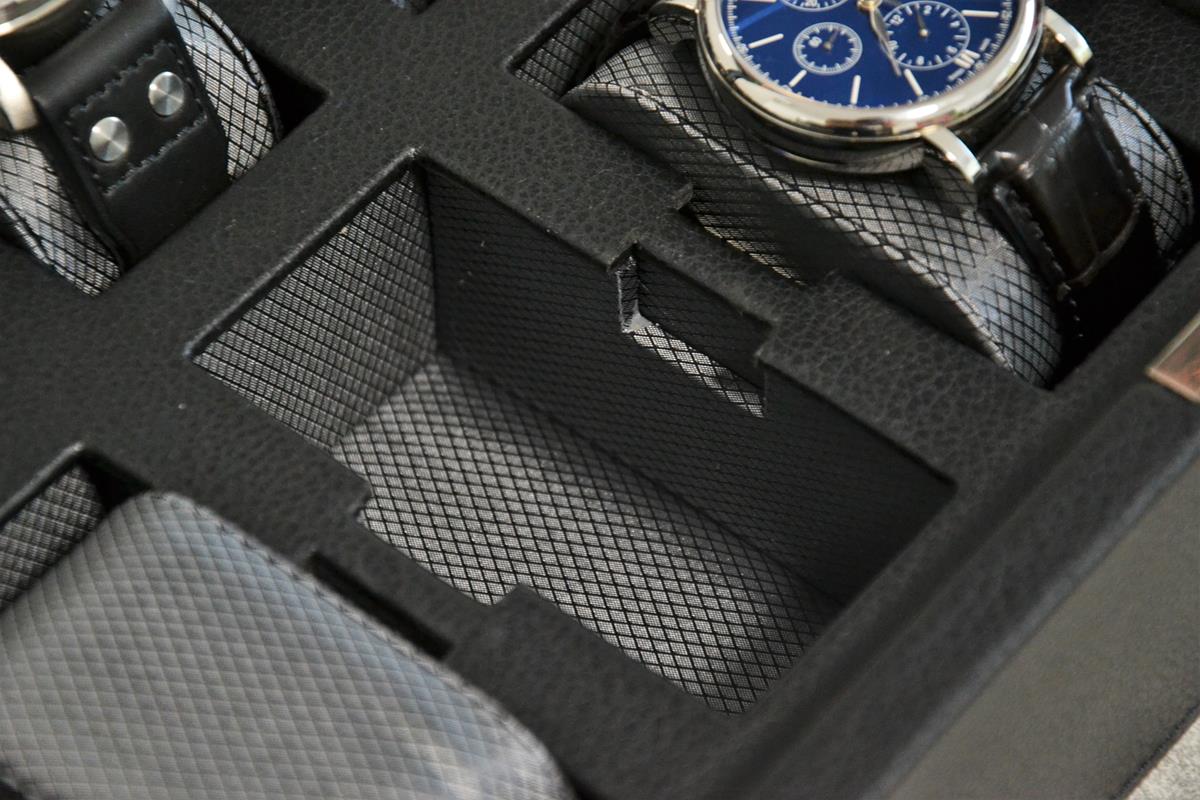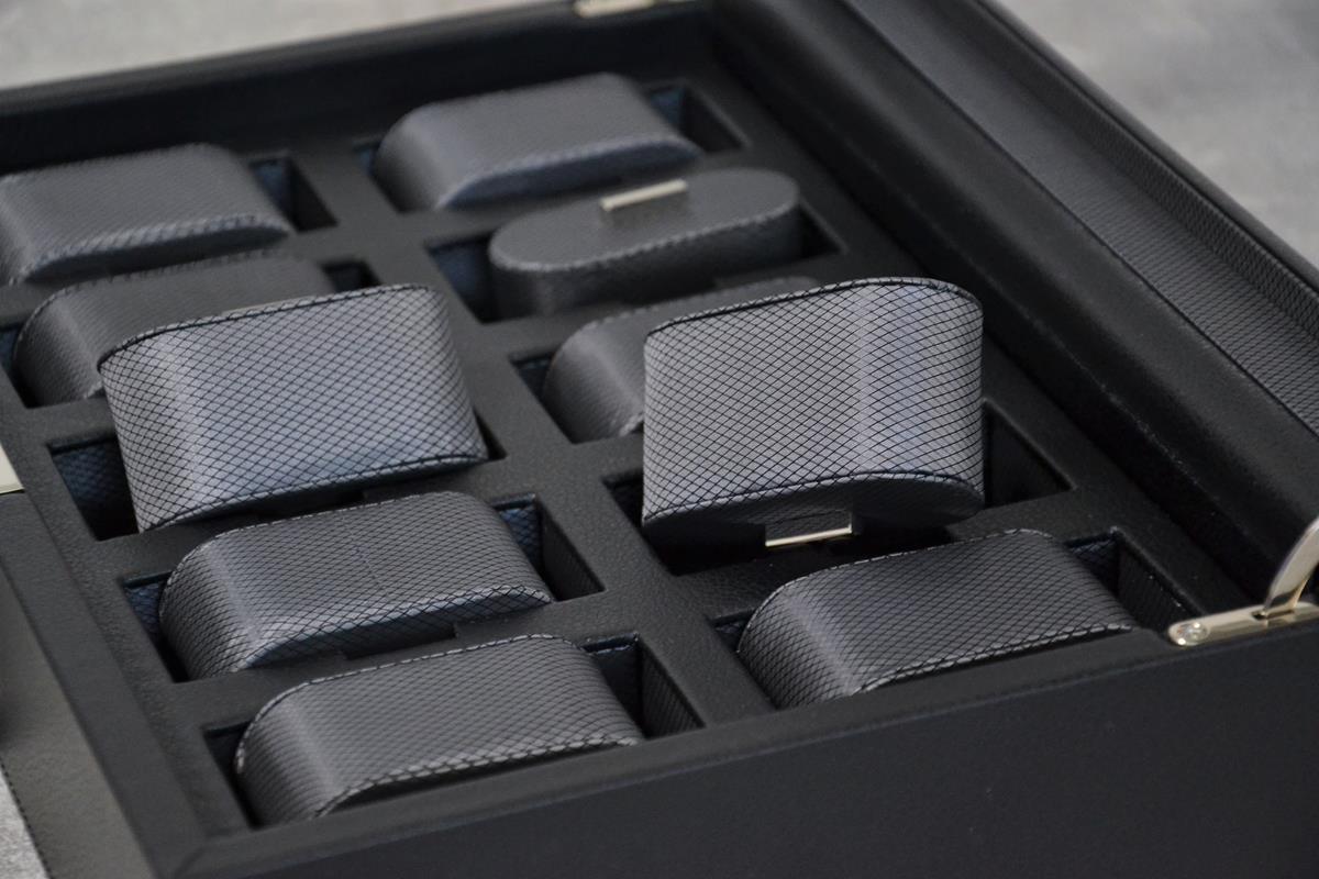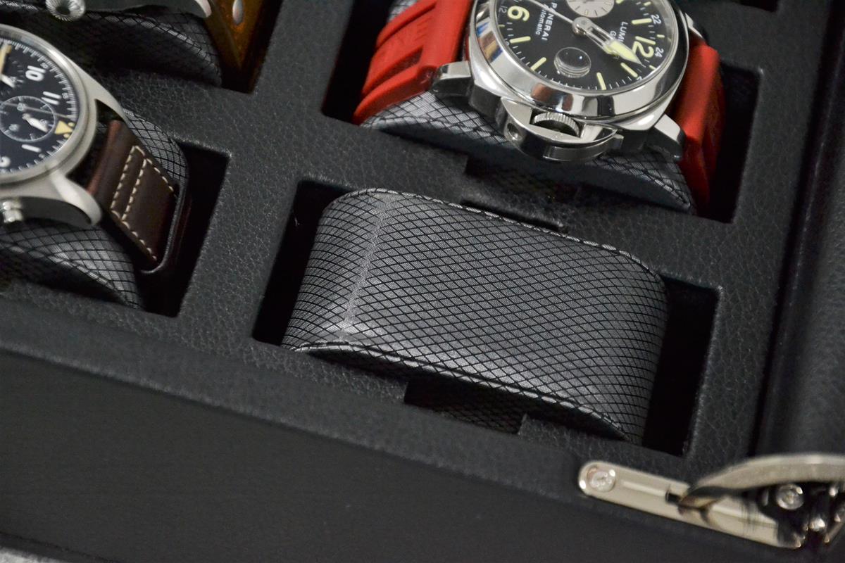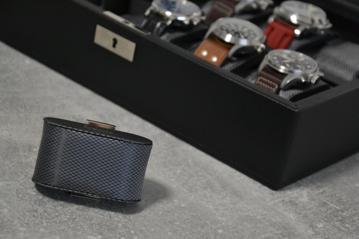 In res. Imeli smo prav! Škatla že na otip opraviči svojo ceno. Narejena je iz veganskega usnja v njej pa se skriva 10 blazinic, kamor boste lahko nataknili svoje ure. Blazinice imajo zanimiv sistem, saj se ob pritisku zožijo in delujejo kot nekakšen meh. Takšen način je zagotovo sila priročen, če imate ure na kovinskih zapestnicah, saj omogočajo precej prilagodljivosti.