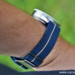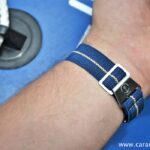 V paketu z uro prideta dva paščka. Brušena kovinska zapestnica s členki v obliki črke H ter nastavljivo varnostno zaponko in temno moder pašček iz elastana s sredinsko črto zlate barve ter kovinskim kaveljčkom za zapenjanje. Slednji je navdih iznajdbe marincev, ki so za pašček uporabljali elastične pasove padal. Res da deluje kot drugi pašček (kar v principu kompleta tudi je), je za vsakdanjo rabo sila uporaben in modno poletno naravnan. Zagotovo bi bila možnost izboljšave zapenjanja, a verjamem, da je tudi v tem primeru gre za nekakšno specifiko.