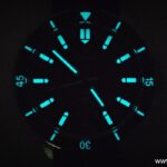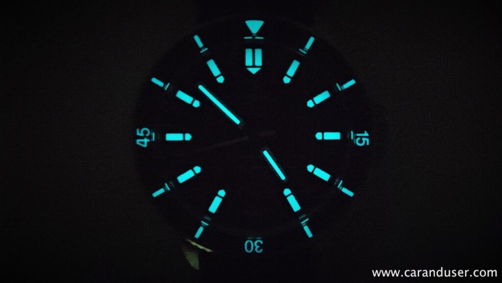 Naslikani urni indeksi se ujemajo z belimi kazalci. Yema je oboje obdelala s švicarskim luminiscenčnim materialom Super-Luminova® BGW9, ki ob slabših svetlobnih pogojih svetijo v blagi svetlo modri svetlobi. Slednje prav tako velja za glavne oziroma 5 minutne skale lunete. Za piko na i, bi sam luminiscenčni material dodal še vsaj na sidro ob 6. uri, za zvrhano mero pa bi še narahlo premazal napis Navygraf. Menite, da bi bilo preveč kičasto? 😊