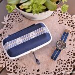 | Pas | Temno moder pašček iz elastana s sredinsko črto zlate barve ter kovinskim kaveljčkom za zapenjanje; dodatno brušena kovinska zapestnica z varnostno zaponko z logotipom; širina 19 mm |