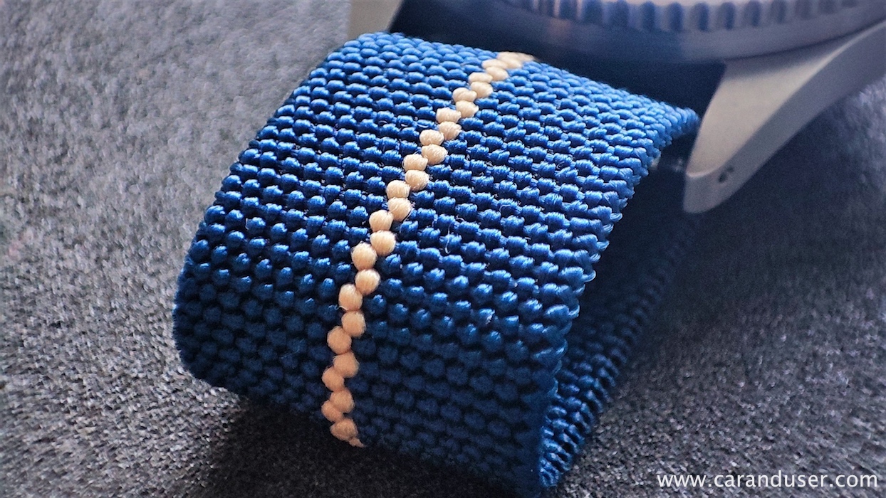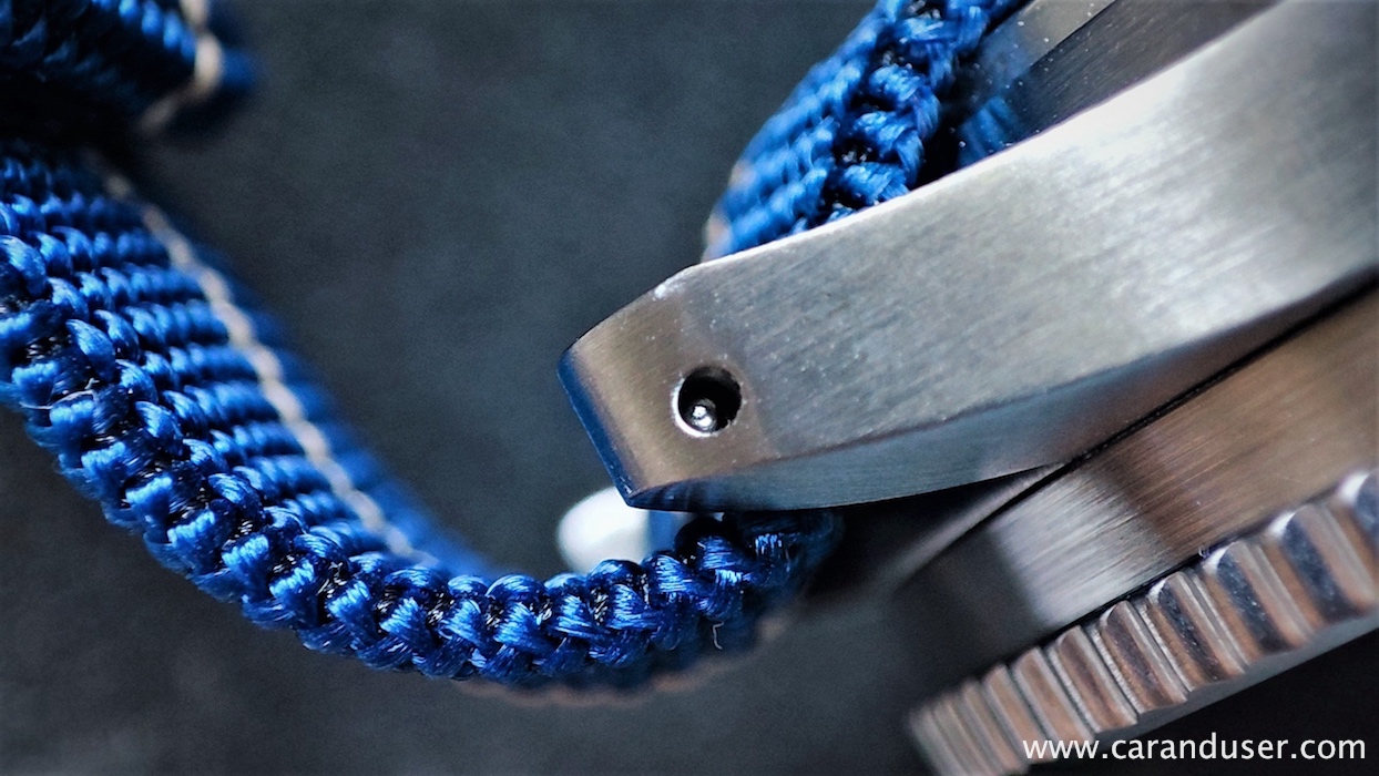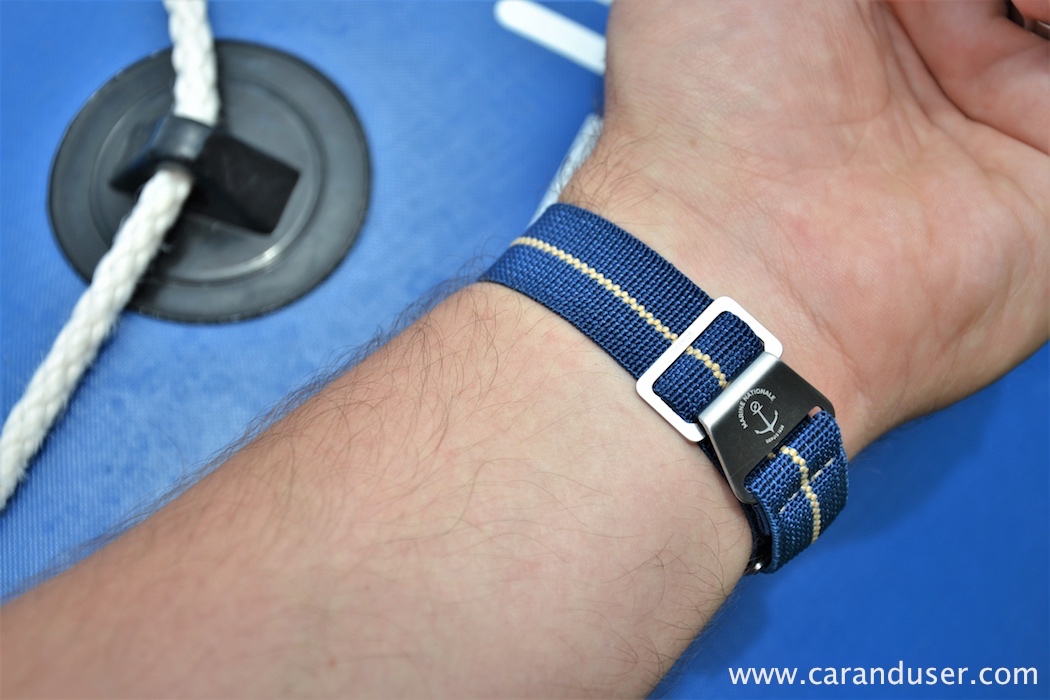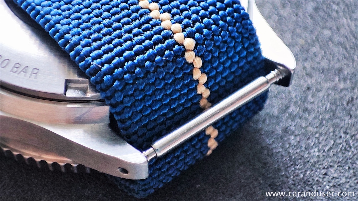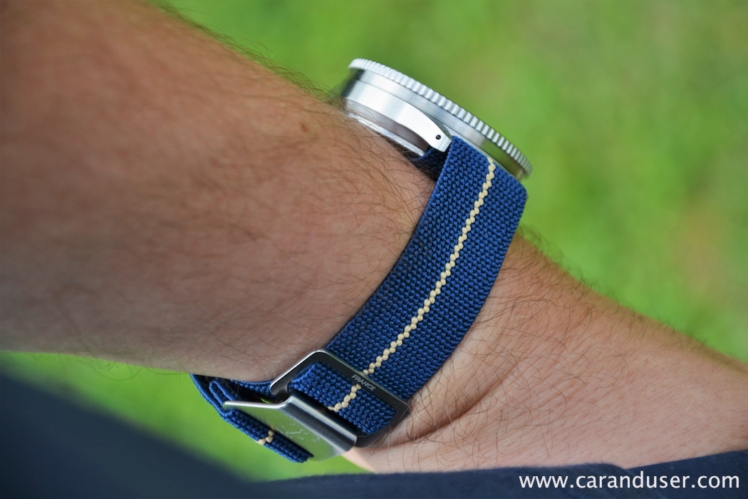 V paketu z uro prideta dva paščka. Brušena kovinska zapestnica s členki v obliki črke H ter nastavljivo varnostno zaponko in temno moder pašček iz elastana s sredinsko črto zlate barve ter kovinskim kaveljčkom za zapenjanje. Slednji je navdih iznajdbe marincev, ki so za pašček uporabljali elastične pasove padal. Res da deluje kot drugi pašček (kar v principu kompleta tudi je), je za vsakdanjo rabo sila uporaben in modno poletno naravnan. Zagotovo bi bila možnost izboljšave zapenjanja, a verjamem, da je tudi v tem primeru gre za nekakšno specifiko.