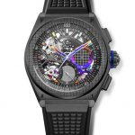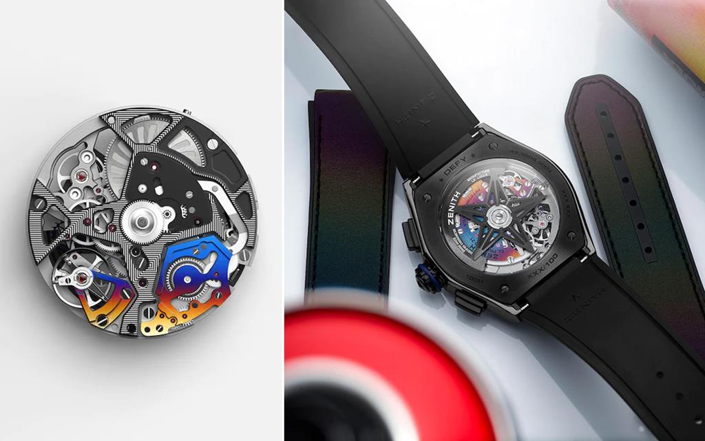 Mehanizem tega Zenitha DEFY 21 je prav tako poseben. Najprej vizualno, saj so nekateri mostovi prevlečeni z drznim mavričnim prelivom. A tudi mehanično, ker bije pri 360.000 vibracijah / uro (ali 50Hz) in tako omogoča prikaz indikatorjev kronografa do 1/100 sekunde. Osrednji sekundi kazalec tega El Primera 9004 se vrti enkrat na sekundo.